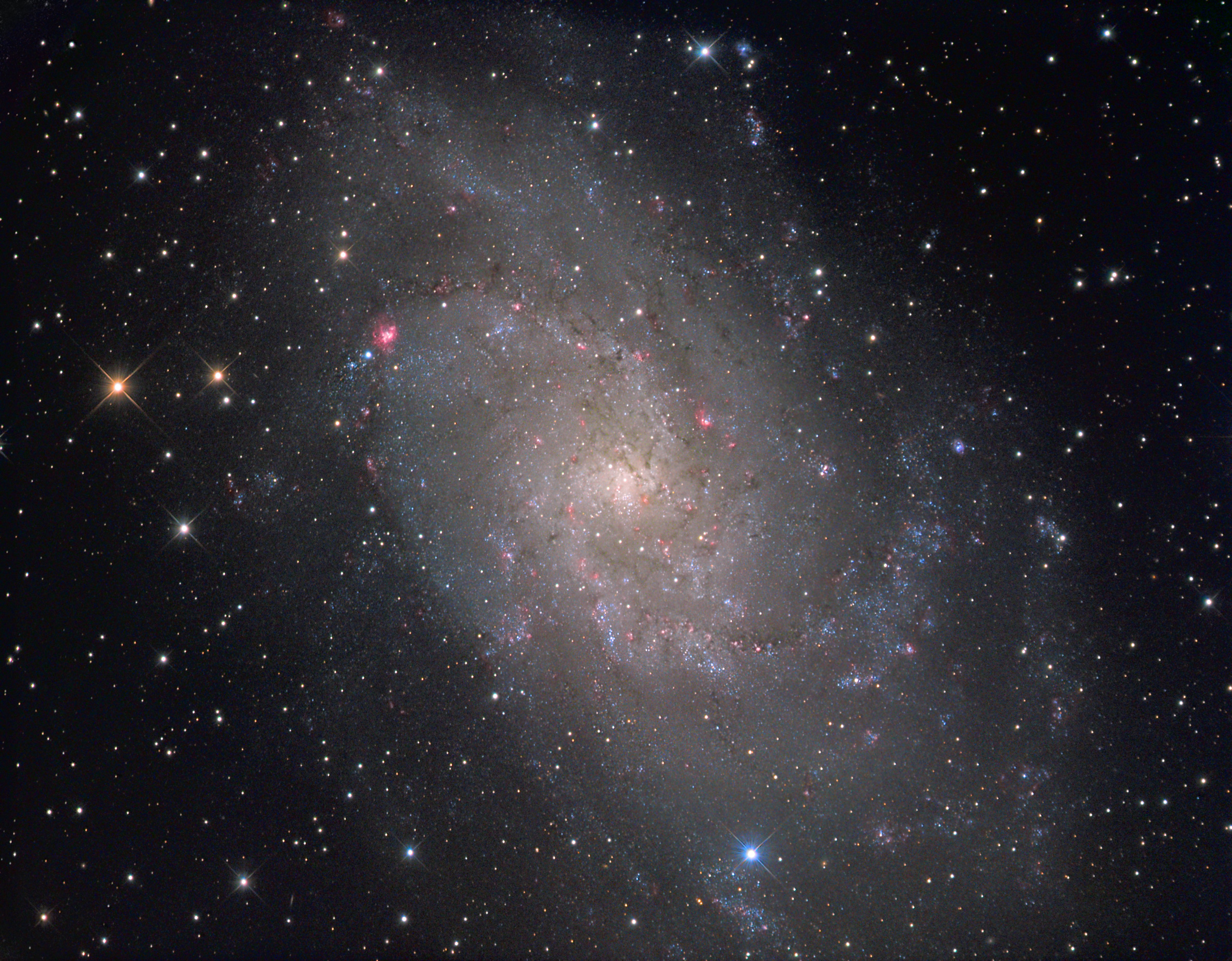 Trotz des Halbmondes konnte ich die relativ guten Bedingungen zweier Novemberabende nutzen, um die Galaxie M 33 mit ihren vielen Einzelobjekten abzulichten.