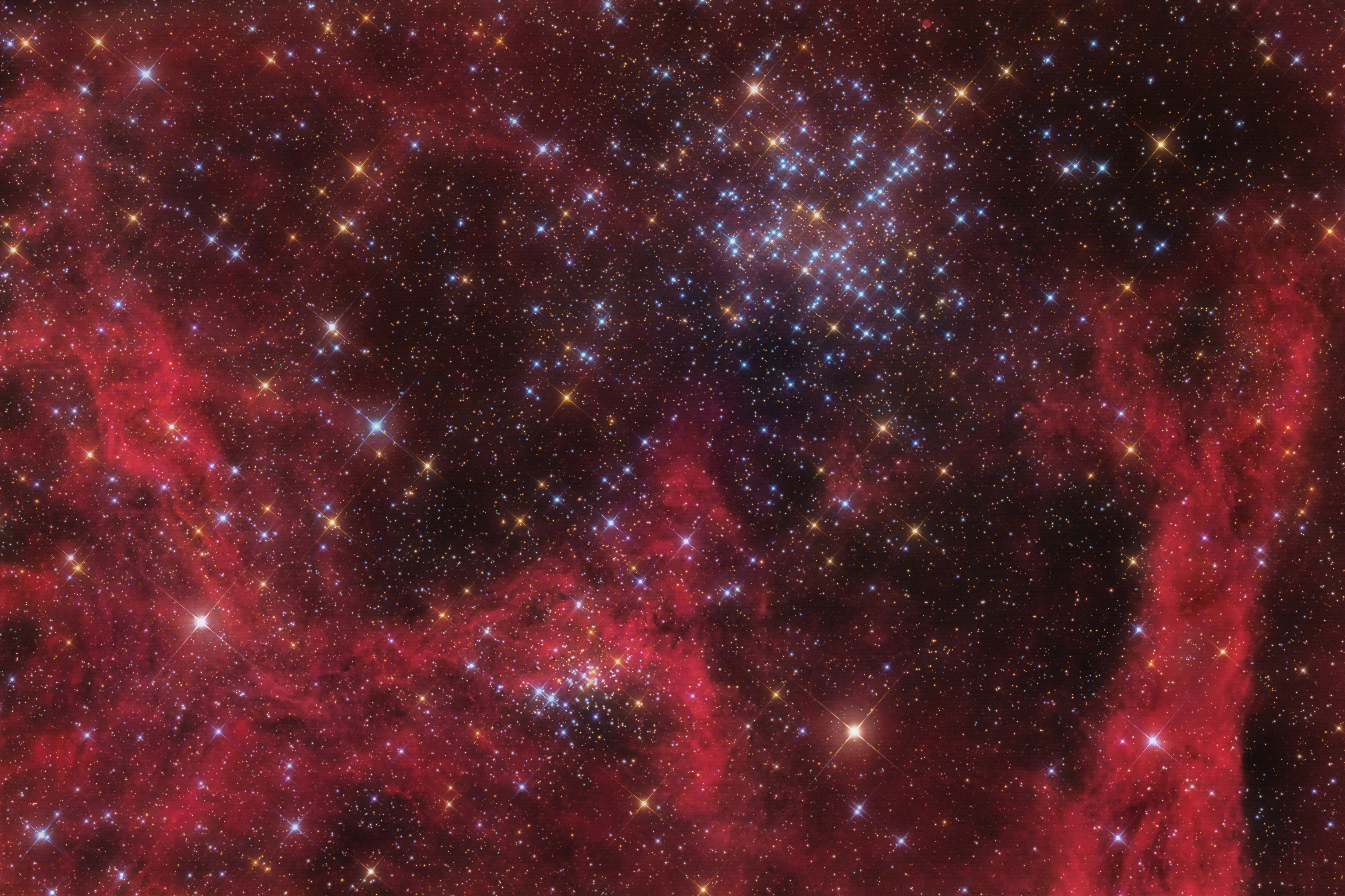 M 38 ist ein 220 Millionen Jahre alter offener Sternhaufen im Fuhrmann, der auch als »Starfish Cluster« bekannt ist. Am nächtlichen Himmel scheint der offene Haufen NGC 1907 (500 Millionen Jahre alt) in unmittelbarer Nähe zu liegen, doch in Wirklichkeit sind beide Objekte weit voneinander entfernt: M 38 ist rund 3480 Lichtjahre weit entfernt von der Erde und NGC 1907 ungefähr 5100 Lichtjahre. Die beiden Sternhaufen scheinen in einem Meer aus H-Alpha-Wolken zu schwimmen. Diese gehören aber zur Taurus-Molekülwolke, die mit einer Entfernung von nur etwa 430 Lichtjahren die der Erde am nächsten gelegene Sternentstehungsregion ist. Bei dieser Aufnahme wollte ich die beiden Sternhaufen in einem anderen Kontext zeigen. Dafür konnte ich auf 5,5, Stunden H-Alpha aus diesem Gebiet zurückgreifen, die ich im Januar für ein anderes Projekt aufgenommen hatte und mit der RGB-Aufnahme kombinieren konnte.
