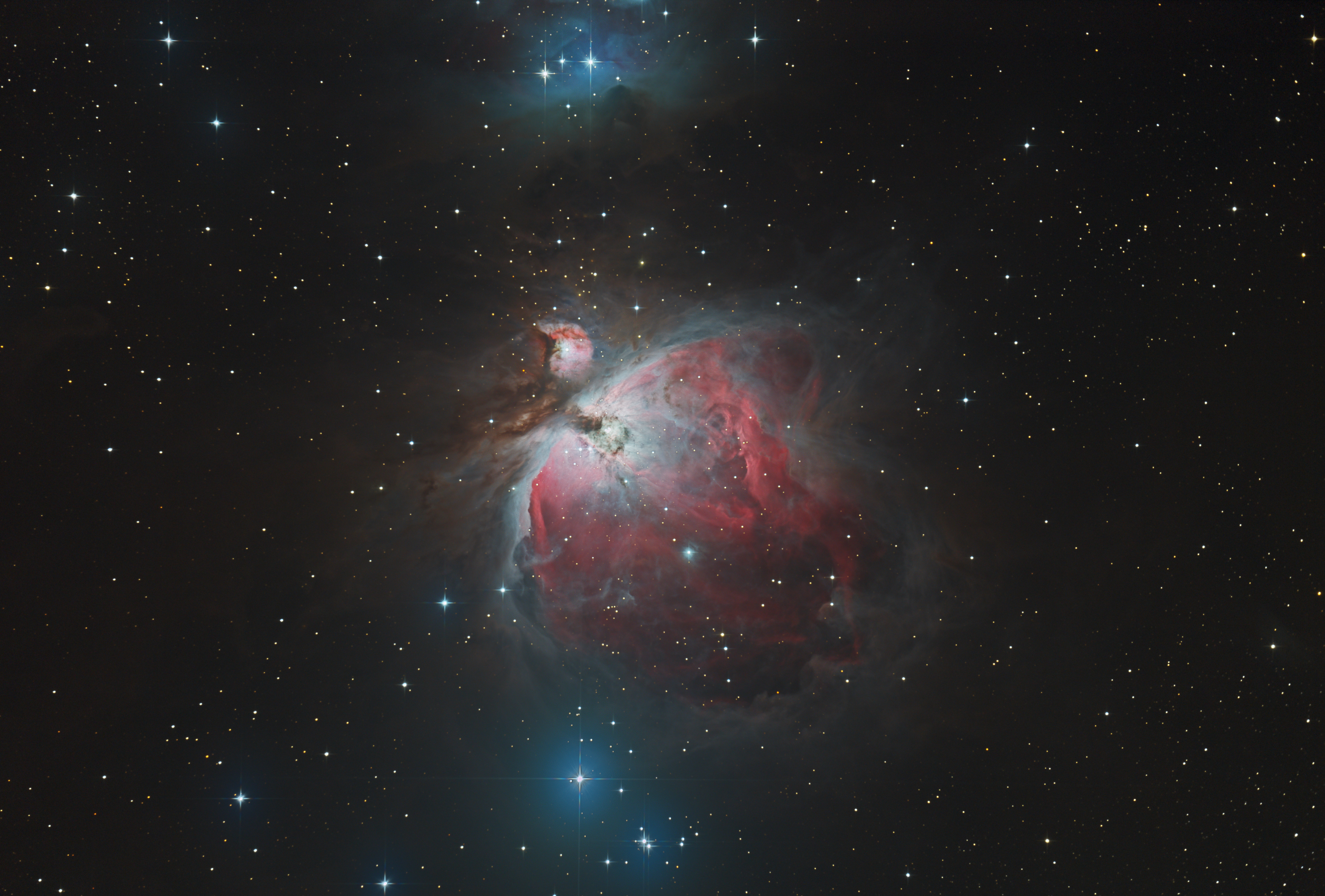 Der große Orionnebel ist zwar ein oft fotografiertes Objekt , hat aber einen enormen Helligkeitsumfang. Um den zu meistern wurden eher kurze Einzelbelichtungen gewählt, 120 x 10 s, 40 x 30 s und 28 x 60 s bei ISO 800 sind im Gesamtbild integriert.
