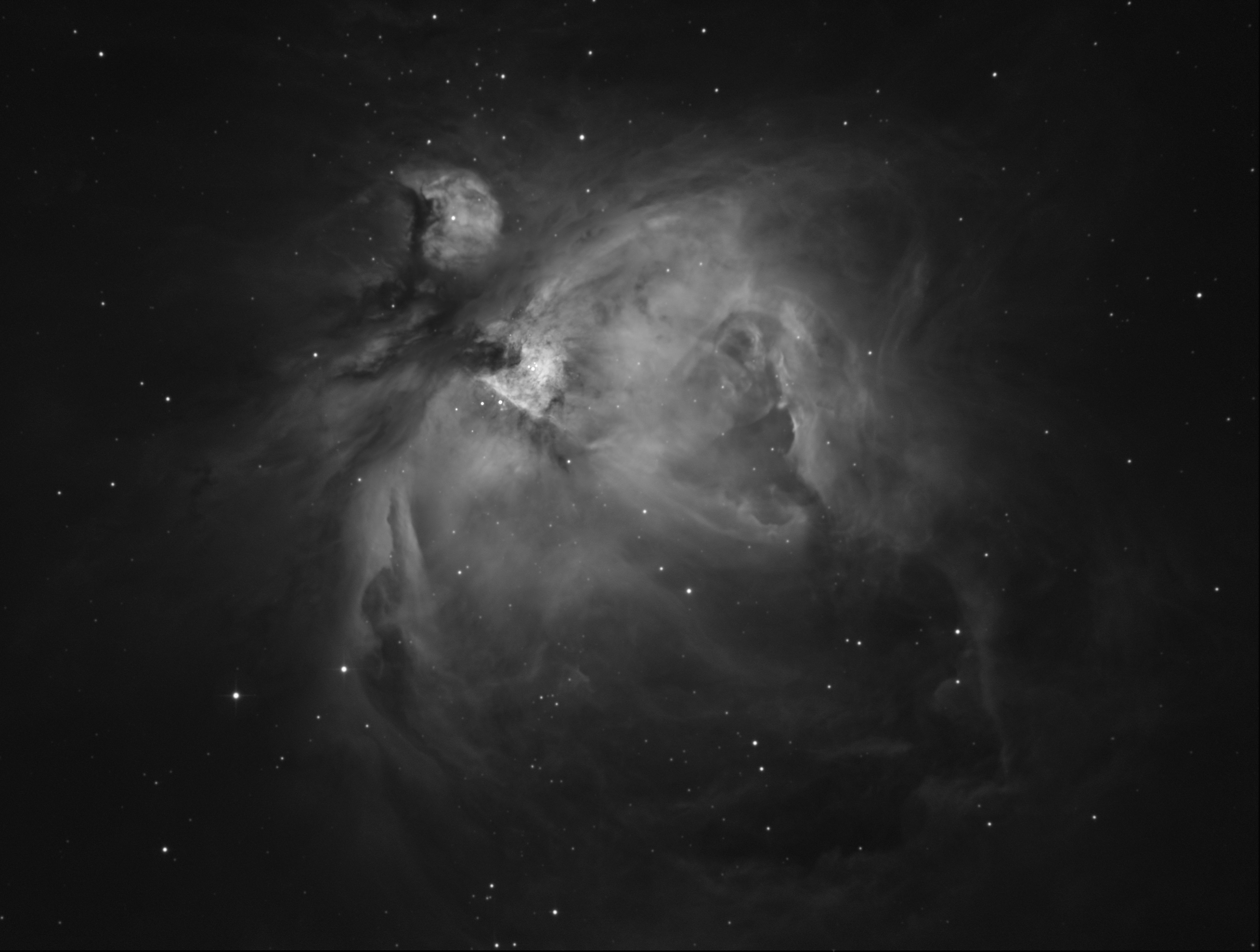 Um während der wenigen klaren Nächte rund um Vollmond doch Astrofotografie betreiben zu können, muss man zu Filtern greifen. Beim Orionnebel ist ein H-Alpha-Filter zweckmäßig, doch der enorme Helligkeitsumfang des Nebels erfordert eine Mischung aus sehr kurzen und längeren Belichtungen.
