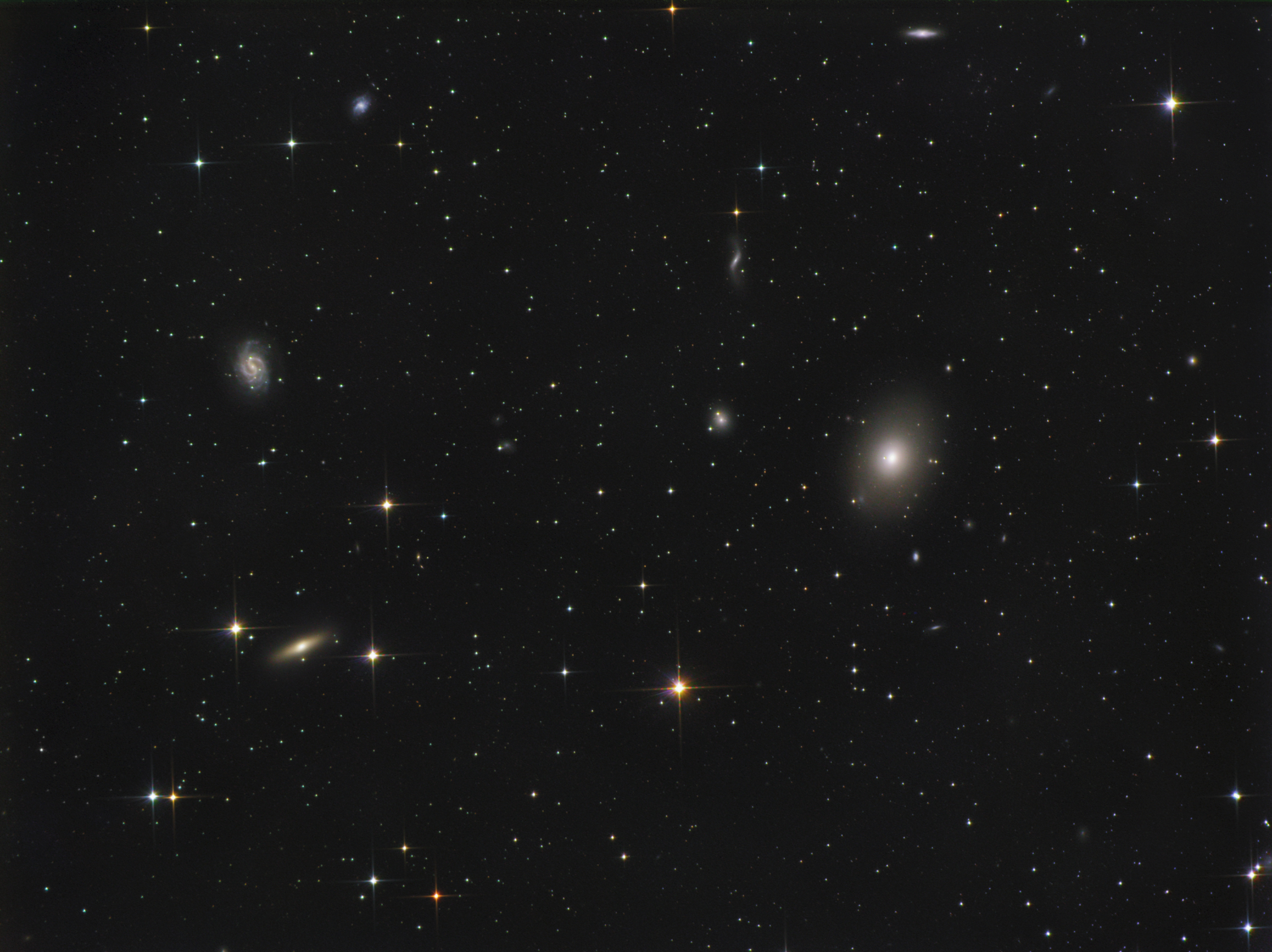 Die Galaxiengruppe aus Messier 49 und NGC 4526/4535 befindet sich im Sternbild Jungfrau (Virgo). Die Objektentfernung von M49 beträgt rund 56 Millionen Lichtjahre. Mit im Bild befindet sich neben etlichen anderen Galaxien auch die Strichspur des Kleinplaneten Sarita (796), (unterhalb von M49). Weitere Daten und Infos: http://www.galaxyphoto.de/m49_I.htm; Objektidentifizierung: http://www.galaxyphoto.de/m49_id.htm