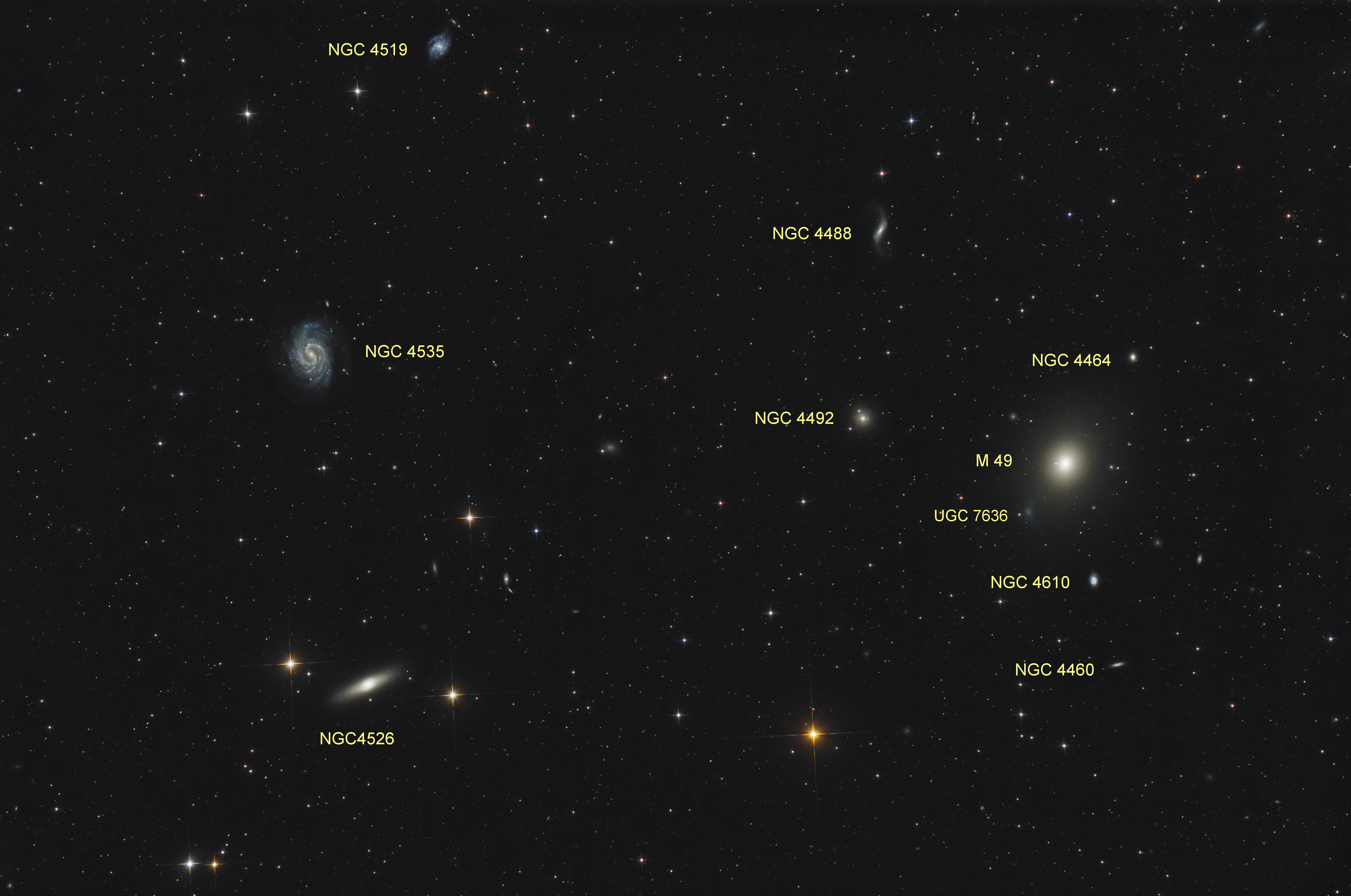 Messier 49 ist eine elliptische Galaxie im Sternbild Jungfrau auf der Ekliptik. Gemeinsam mit der irregulären Galaxie UGC 7636 bildet diese einen Eintrag im Arp-Katalog (Arp 134). Halton Arp gliederte seinen Katalog ungewöhnlicher Galaxien nach rein morphologischen Kriterien in Gruppen. Diese Galaxie gehört zu der Klasse der Elliptischen Galaxien mit nahen Fragmenten (Arp-Katalog). Messier 49 war die erste Galaxie des Virgo-Galaxienhaufens, die gefunden wurde. Entdeckt wurde sie am 19. Februar 1771 vom französischen Astronomen Charles Messier. M49 ist zudem das hellste Mitglied dieses Galaxienhaufens, der etwa 41 Millionen Lichtjahre entfernt ist. M49 ist eine elliptische Riesengalaxie, die einen hellen kompakten Kern und einen weit ausgedehnten diffusen Halo besitzt. Die Galaxie besitzt ein System von Kugelsternhaufen mit etwa 7000 Mitgliedern. NGC 4526 = NGC 4560 ist eine linsenförmige Galaxie vom Hubble-Typ SB0 im Sternbild Jungfrau auf der Ekliptik. Sie ist schätzungsweise 25 Millionen Lichtjahre von der Milchstraße entfernt und hat einen Durchmesser von etwa 40.000 Lichtjahren. Gemeinsam mit zwölf weiteren Galaxien bildet sie die NGC 4442-Gruppe (LGG 288) und wird unter der Katalognummer VCC 1535 als Mitglied des Virgo-Galaxienhaufens aufgeführt. NGC 4535 ist eine Balkenspiralgalaxie vom Hubble-Typ SAB(s)c im Sternbild Jungfrau auf der Ekliptik, die schätzungsweise 85 Millionen Lichtjahre von der Milchstraße entfernt. Weil die Galaxie in kleineren Teleskopen leicht zu übersehen ist, wird sie manchmal »Lost Galaxy« (Verlorene Galaxie) genannt. Dieser Spitzname geht auf einen Artikel des Amateurastronomen Leland S. Copeland aus den 1950er-Jahren zurück.