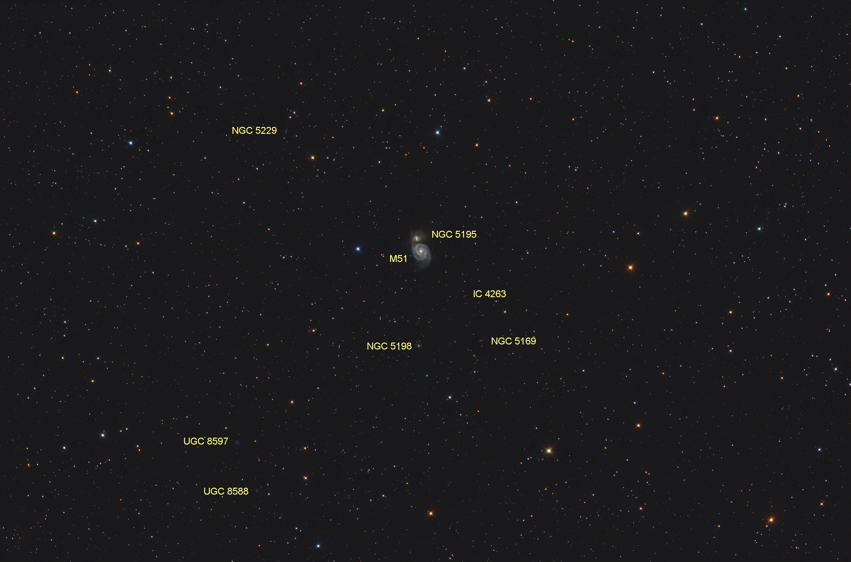 Mit einer Vollformatkamera und einer Brennweite von 430 mm ergeben sich relativ große Bildfelder von 5° x 3° am Himmel. Der Vollmond hat zum Vergleich etwa 0,5° scheinbaren Durchmesser. Da erscheint dann die "Strudelgalaxie" Messier 51 relativ verloren im Sternbild Jagdhunde. Dafür sind aber auch einige Galaxien im Hintergrund zu erkennen.