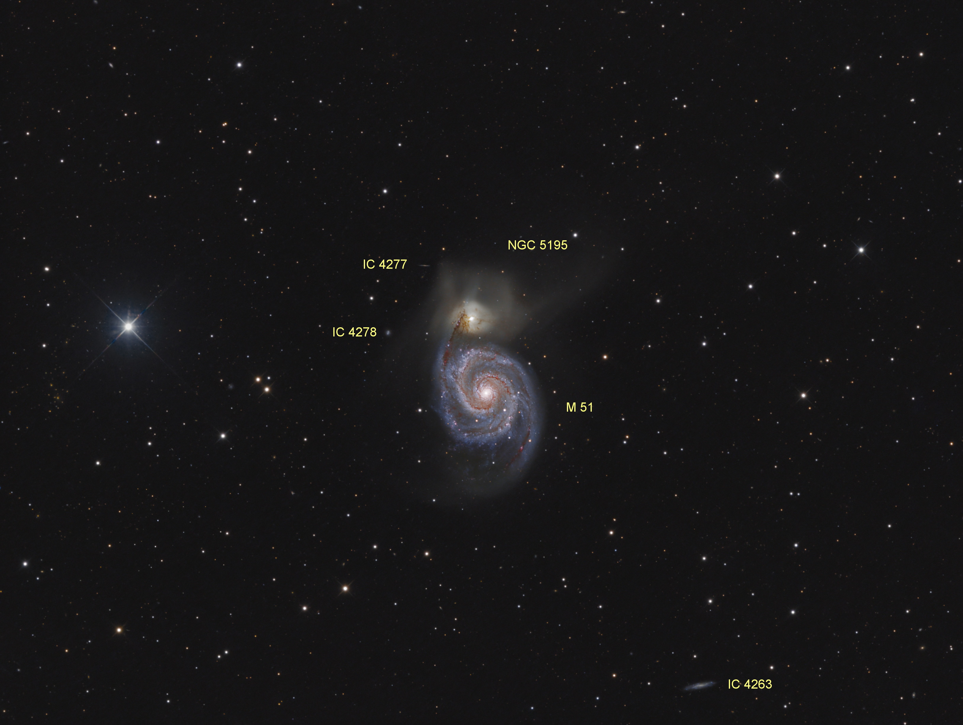 M 51 wird auch als Whirlpool-Galaxie bezeichnet. Im Katalog der ungewöhnlichen Galaxien von Halton Arp trägt sie die Nr. 85 und gehört zur Klasse der »Spiralgalaxien mit einem großen Begleiter auf einem Arm«. Dieser Begleiter ist die Galaxie NGC 5195. M 51 ist auch eine Seyfert-Galaxie mit aktivem Kern und supermassivem Schwarzen Loch im Zentrum.