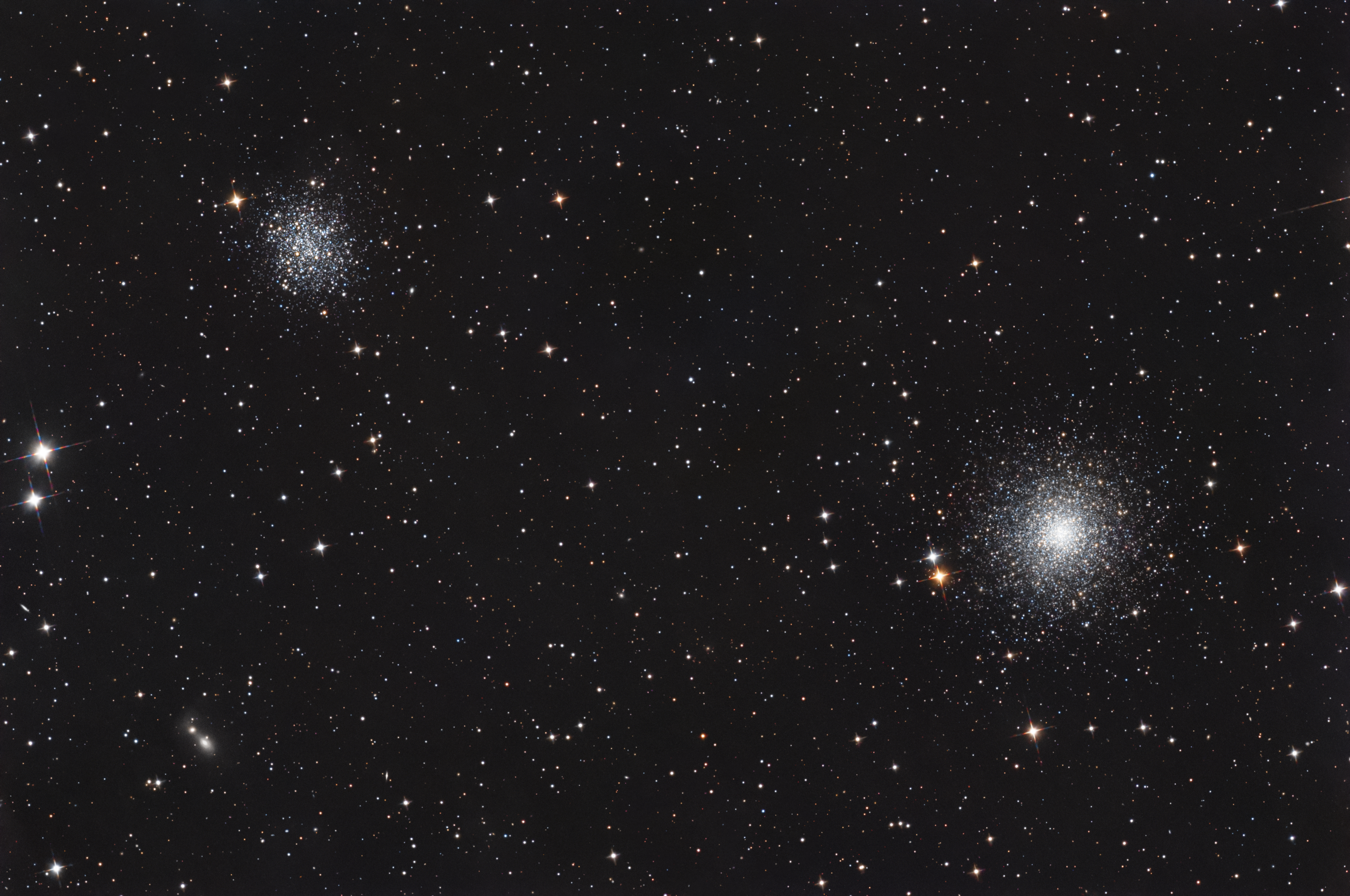 Dieses schöne und ungleiche Paar zeigt zwei Typen von Kugelsternhaufen. NGC 5053 links oben ist schwach konzentriert und beinhaltet nur 3500 Sterne, während M 53 es auf ungefähr 750000 Sterne bringt. Herausfordernd ist hier, dass die Kerne nicht überbelichtet werden, weshalb man hier mit kurzen Einzelbelichtungen arbeiten sollte. Die Haufen befinden sich in rund 60000 Lichtjahren Entfernung.