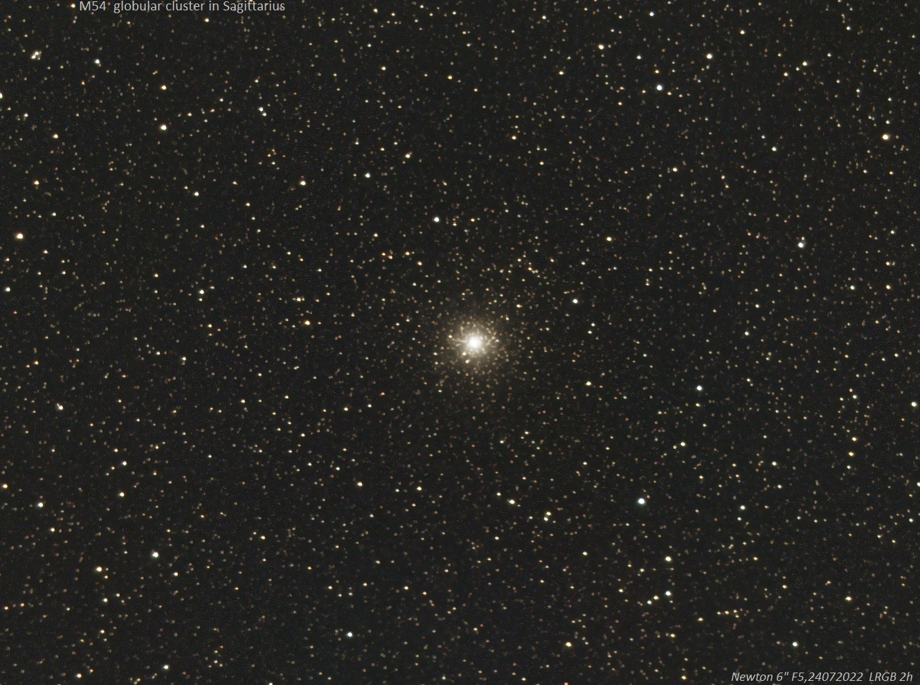 Genau vier Grad südlich von Sigma Sagittarii kulminiert in nur 10 Grad Höhe (Deklination -31 Grad) dieser schwache, fast vergessene Kugelsternhaufen (7,7 mag, Durchmesser 9 Bogenminuten). Charles Messier entdeckte ihn am 24. Juli 1778, zufällig gerade 244 Jahre vor meiner Aufnahme ... Auch mit größeren Öffnungen lässt er sich visuell nicht in Einzelsterne auflösen. Das erklärt sich durch seine große Entfernung von 87000 Lichtjahren (linear 150 Lichtjahre Durchmesser), wodurch er zu den drei bekannten extragalaktischen Kugelsternhaufen gehört. 1994 entdeckte man seine Zugehörigkeit zur damals (1993) gefundenen Sagittarius Dwarf Elliptical Galaxy (Sag DEG). Sein Alter wird auf 12 Milliarden Jahre geschätzt. Die starke Konzentration von Typ III kann man schon auf der Aufnahme erkennen! 2009 meldete ein Astronomenteam einen Hinweis auf ein Schwarzes Loch (intermediate mass black hole) im Zentrum. Auch das HST hat sich seiner angenommen und den Kugelsternhaufen in tausende Sterne aufgelöst.