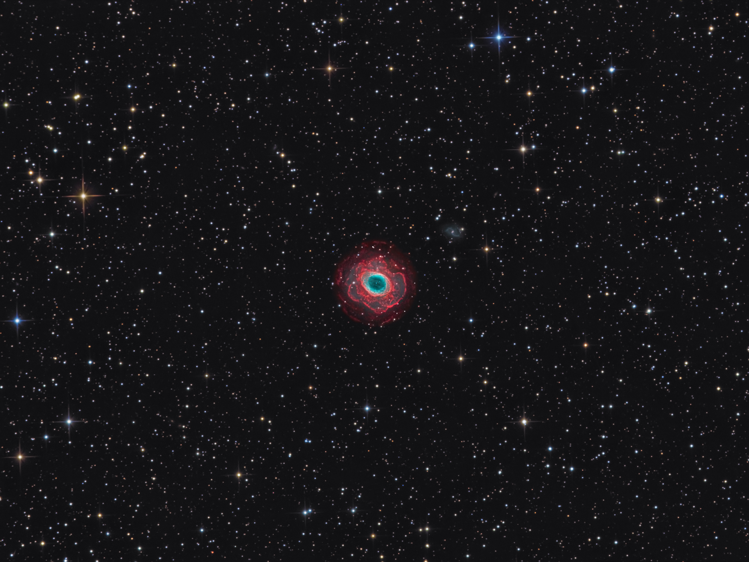 Der Ringnebel ist ein Planetarischer Nebel im Sternbild Leier. Der Nebel ist der Überrest eines Sterns, der vor etwa 20000 Jahren seine äußere Gashülle abgestoßen hat. Die Gashülle dehnt sich mit einer Geschwindigkeit von 19 Kilometern pro Sekunde aus und hat derzeit einen scheinbaren Durchmesser von rund 118 Bogensekunden, was bei einer Entfernung von 2300 Lichtjahren einen absoluten Durchmesser von rund 1,3 Lichtjahren bedeutet. Im Teleskop erscheint der Nebel ringförmig, weshalb er oft auch als Ringnebel in der Leier bezeichnet wird. Mit dem H-alpha-Filter ist es mir gelungen, die äußeren Gasschalen darzustellen