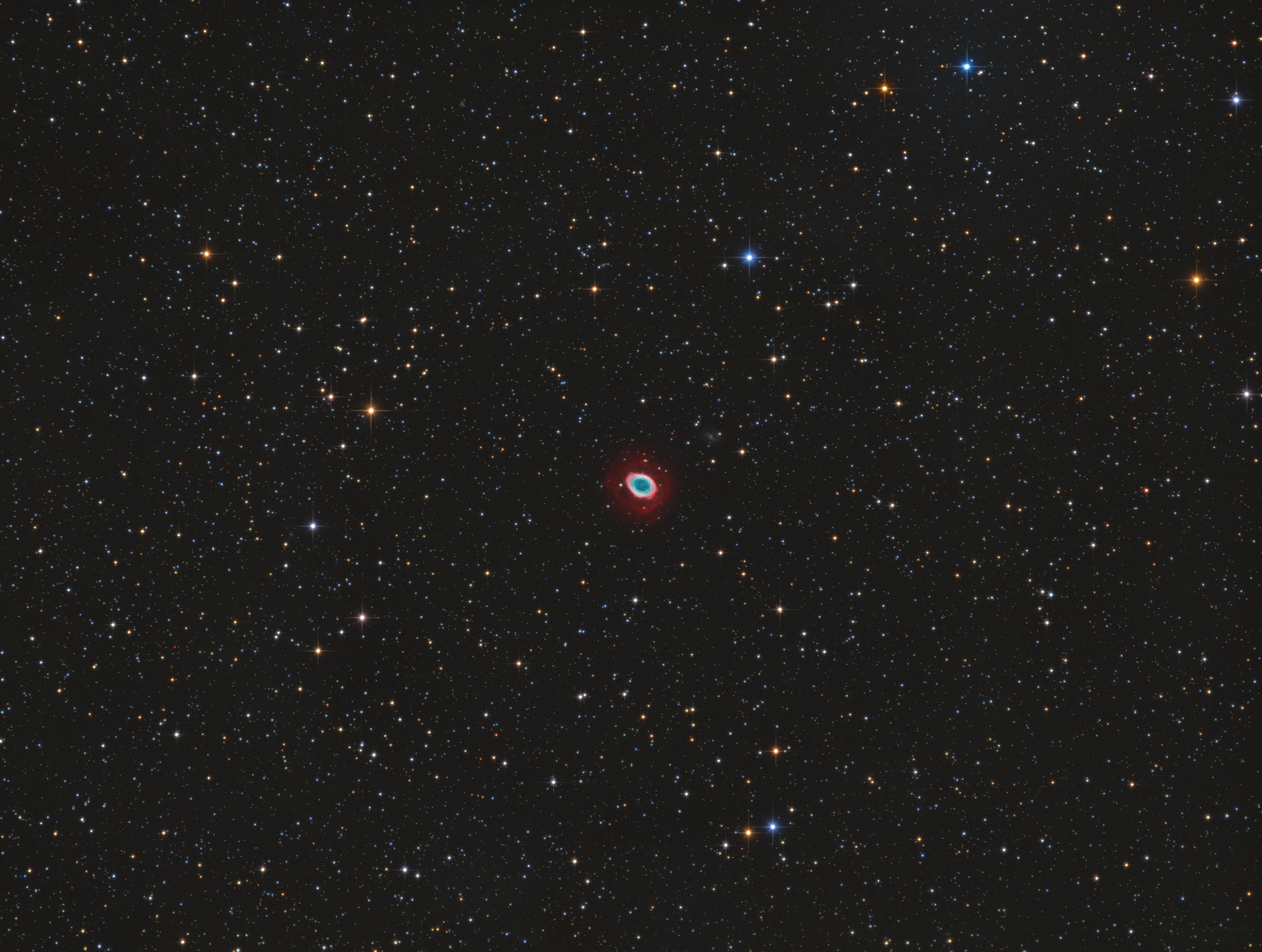 M 57 (Ringnebel) ist einer der bekanntesten planetarischen Nebel. Er liegt in einer Entfernung von ca. 2300 Lichtjahren im Sternbild Leier. Die Aufnahme ist in mehreren Nächten im April 2019 entstanden. Der Ringnebel zeigt eine mehrfache Schalenstruktur, durch zahlreiche H-Alpha-Aufnahmen wurden Teile dieser äußeren Schale sichtbar. Nordwestlich befindet sich die Balkenspiralgalaxie IC 1296 in einer Entfernung von rund 230 Millionen Lichtjahren. Weitere Informationen und Bilder: http://galaxyphoto.de/de/m057-de/