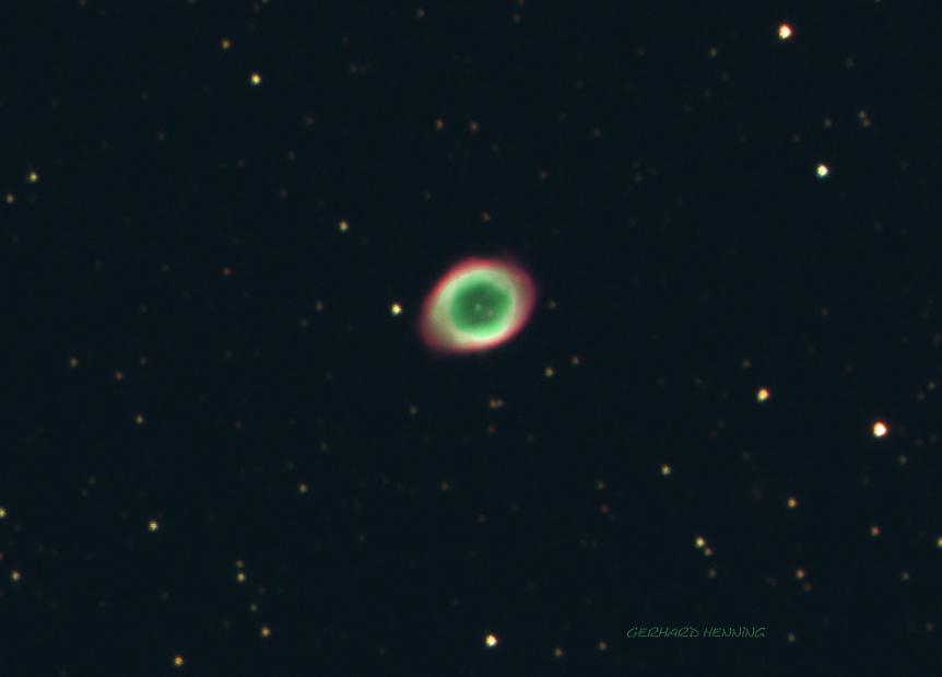 M 57 ist ein planetarischer Nebel und ca. 2300 Lichtjahre von uns entfernt. Das Leuchten kommt von ionisiertem Sauerstoff (grün-blau) und Wasserstoff (rot). Im Zentrum ist ein Weißer Zwerg und ganz gut zu erkennen.