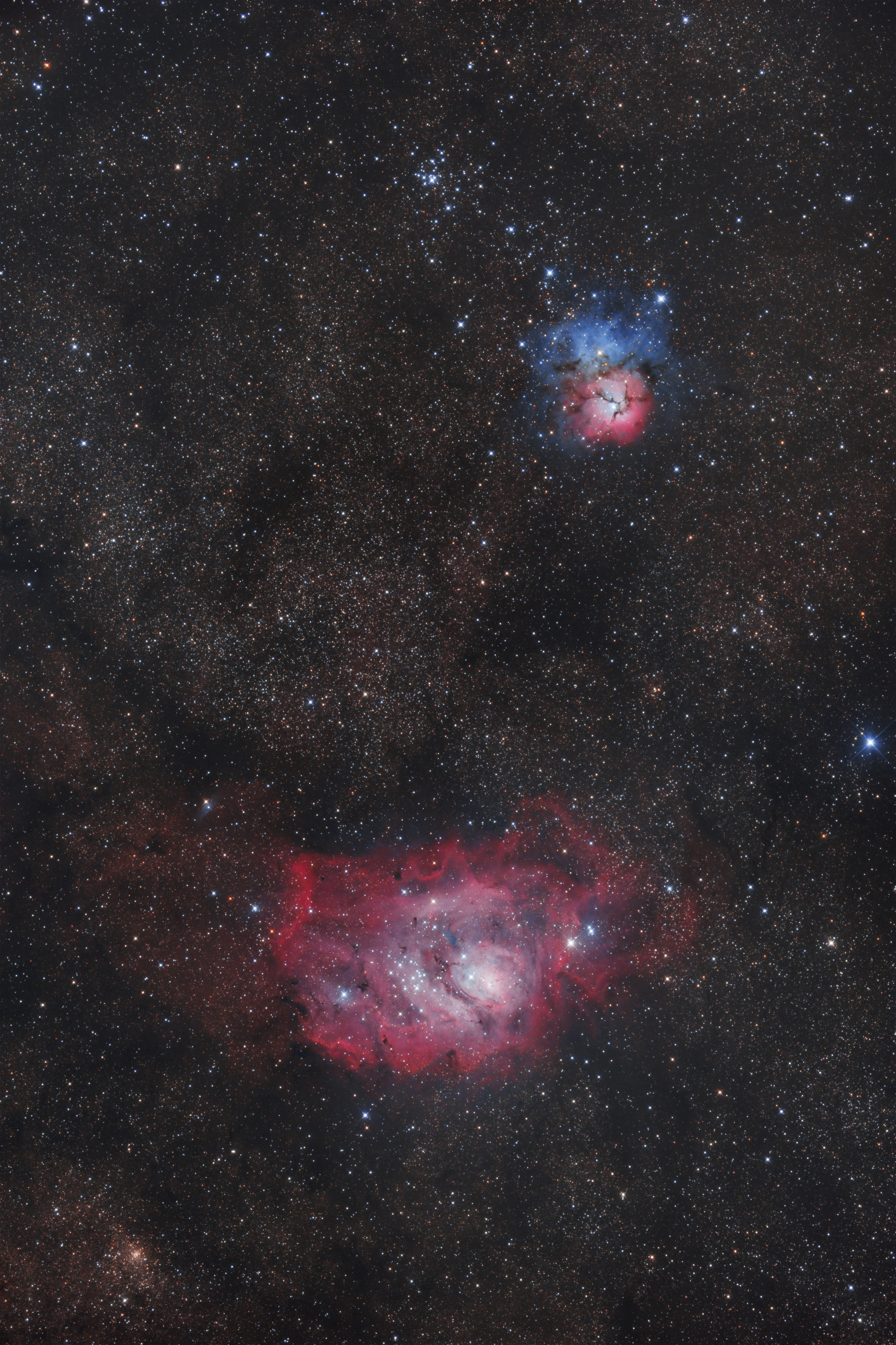 Der Lagunennebel ist eine Struktur aus Emissions- und Reflexionsnebel im Sternbild Schütze. Er ist etwa 5200 Lichtjahre von der Sonne entfernt. Als großes Sternentstehungsgebiet enthält er mehrere dunkle protostellare Wolken, so genannte Globulen, deren Durchmesser bei etwa 10000 AE liegen. Im Zentrum des Nebels befindet sich der junge offene Sternhaufen NGC 6530, der aus dem Material des Nebels entstanden ist und ihn jetzt zum Leuchten bringt. Der Trifidnebel ist auch ein Emissions- und Reflexionsnebel. Der Name entstammt dem lateinischen Wort trifidus »dreigeteilt, dreigespalten«, da eine dunkle Staubwolke (Barnard 85) den Nebel dreiteilt. Der Trifidnebel ist ein Ort der Sternentstehung , die Ionisation des Hauptnebels erfolgt durch den heißen Stern HD 164492, der zum O7-Typ gehört. Im Inneren des Nebels verstecken sich noch einige nur im Infraroten sichtbare massereiche Protosterne. Die Entfernung des Trifidnebels von der Erde beträgt etwa 5200 Lichtjahre.