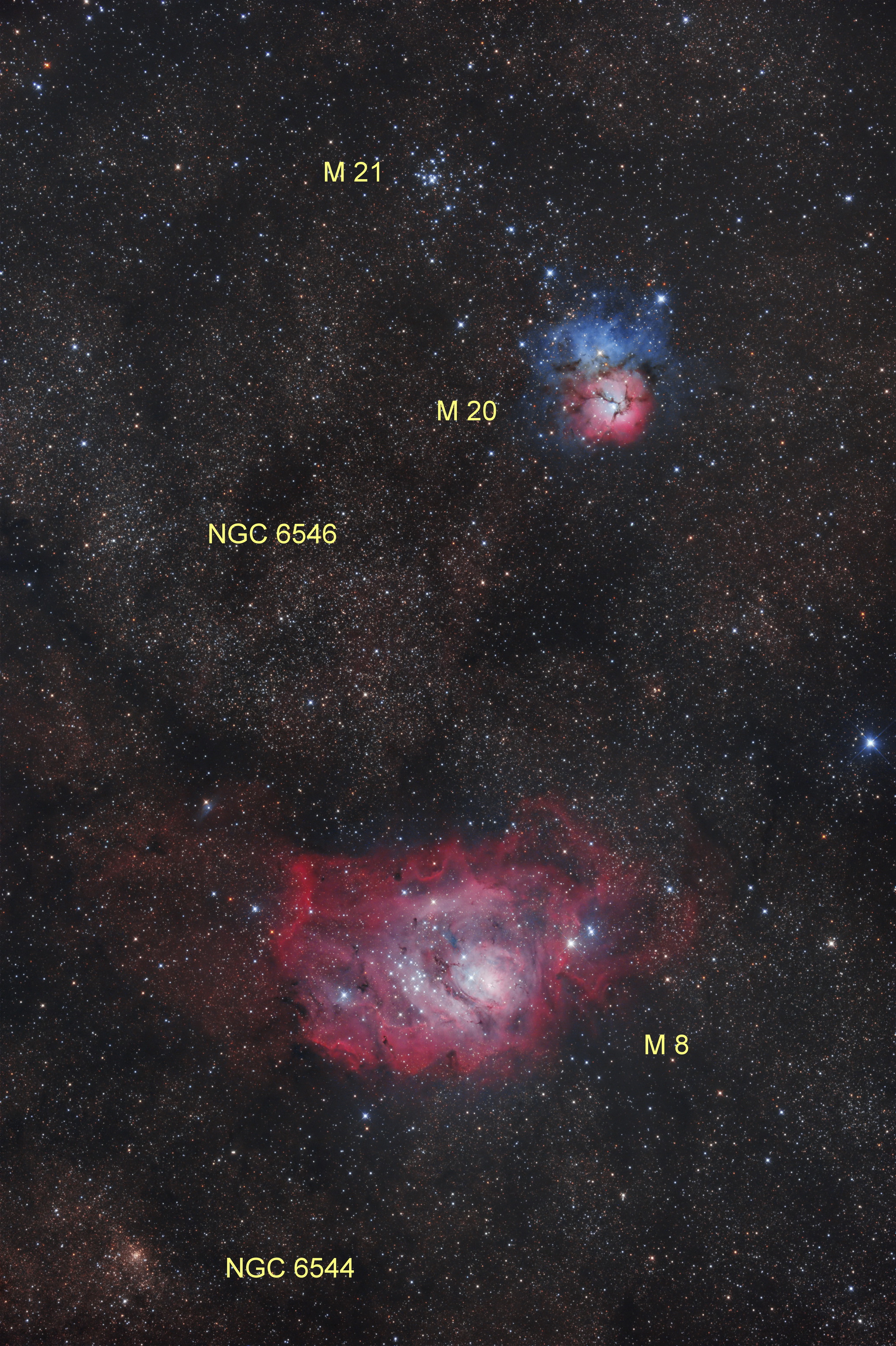 Der Lagunennebel ist eine Struktur aus Emissions- und Reflexionsnebel im Sternbild Schütze. Er ist etwa 5200 Lichtjahre von der Sonne entfernt. Als großes Sternentstehungsgebiet enthält er mehrere dunkle protostellare Wolken, so genannte Globulen, deren Durchmesser bei etwa 10000 AE liegen. Im Zentrum des Nebels befindet sich der junge offene Sternhaufen NGC 6530, der aus dem Material des Nebels entstanden ist und ihn jetzt zum Leuchten bringt. Der Trifidnebel ist auch ein Emissions- und Reflexionsnebel. Der Name entstammt dem lateinischen Wort trifidus »dreigeteilt, dreigespalten«, da eine dunkle Staubwolke (Barnard 85) den Nebel dreiteilt. Der Trifidnebel ist ein Ort der Sternentstehung , die Ionisation des Hauptnebels erfolgt durch den heißen Stern HD 164492, der zum O7-Typ gehört. Im Inneren des Nebels verstecken sich noch einige nur im Infraroten sichtbare massereiche Protosterne. Die Entfernung des Trifidnebels von der Erde beträgt etwa 5200 Lichtjahre. Messier 21 ist ein +5,9 mag heller offener Sternhaufen . NGC 6544 ist ein Kugelsternhaufen, der am 22. Mai 1784 von dem Astronomen William Herschel mit einem 18,7-Zoll-Teleskop entdeckt wurde. NGC 6546 ist ein offener Sternhaufen vom Trumler-Typ III2m im Sternbild Schütze auf der Ekliptik.