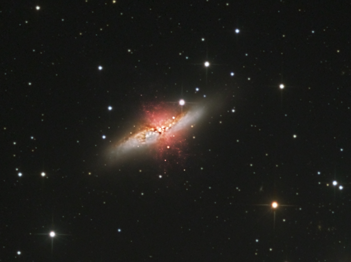 Da M 82 eine sehr schöne Galaxie ist, welche natürlich auch oft zu sehen ist, war ich gespannt, was ich mit meinen "lumpigen" 800 mm Brennweite an Details rausholen kann. Von 52 Luminanzen a 600 s habe ich 27 nach ADU und FWHM aussortiert und noch je 10 RGBs 2x2 bin hinzugefügt. Die Belichtung von H-alpha-Bildern brachte auf Grund schlechter Bedingungen nicht allzuviel, so dass diese das Ergebnis nur schlechter gemacht hätten. Wieder mit dem Resultat: "Ich benötige mehr Brennweite..."