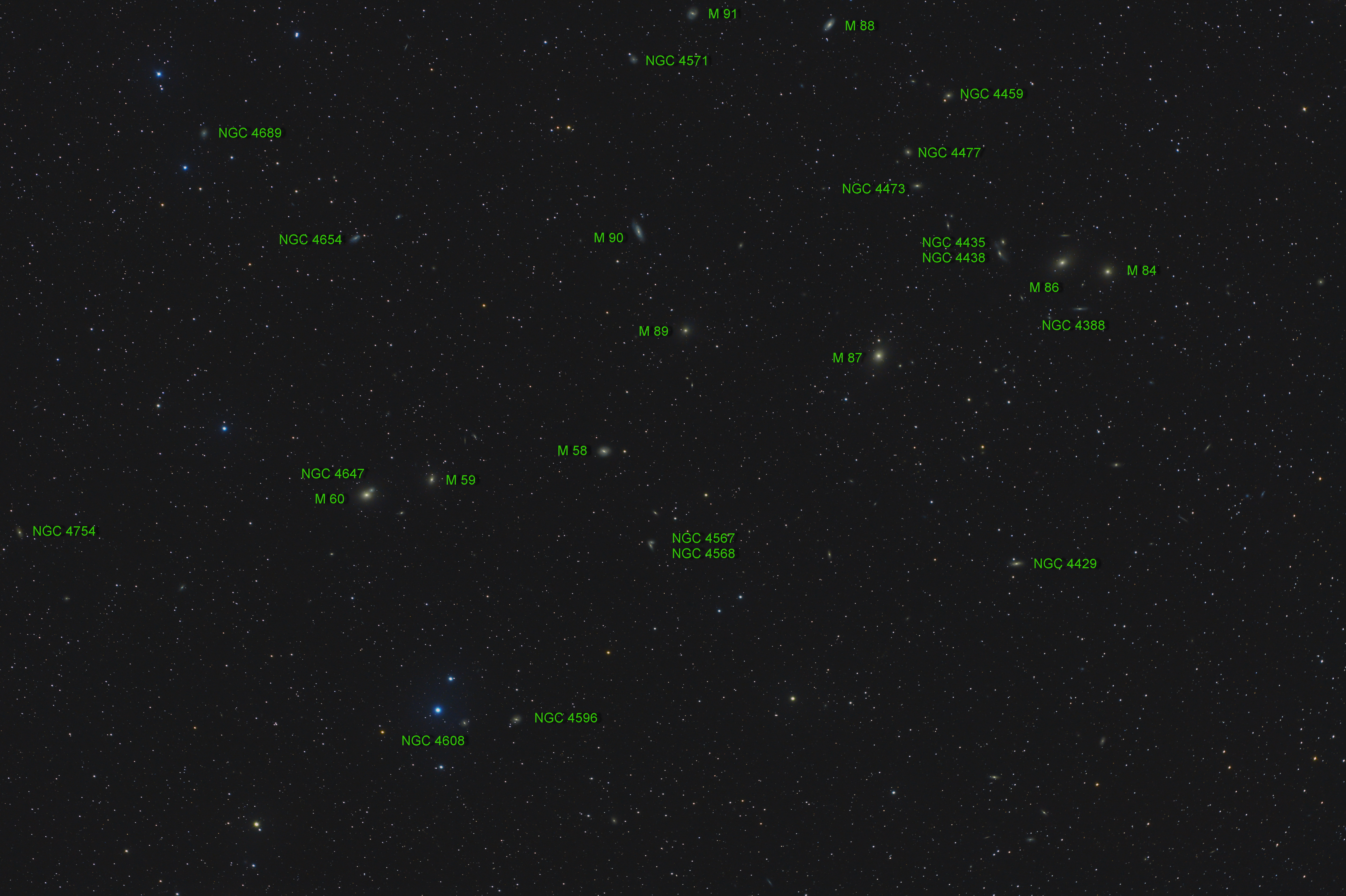Im Sternbild Jungfrau liegt nicht nur die Markarian Galaxienkette, im Bild rechts oben, sondern auch weitere Galaxiengruppen. M90 ist eine helle Balken-Spiralgalaxie des Virgo-Galaxienhaufens und rund 44 Millionen Lichtjahre entfernt.