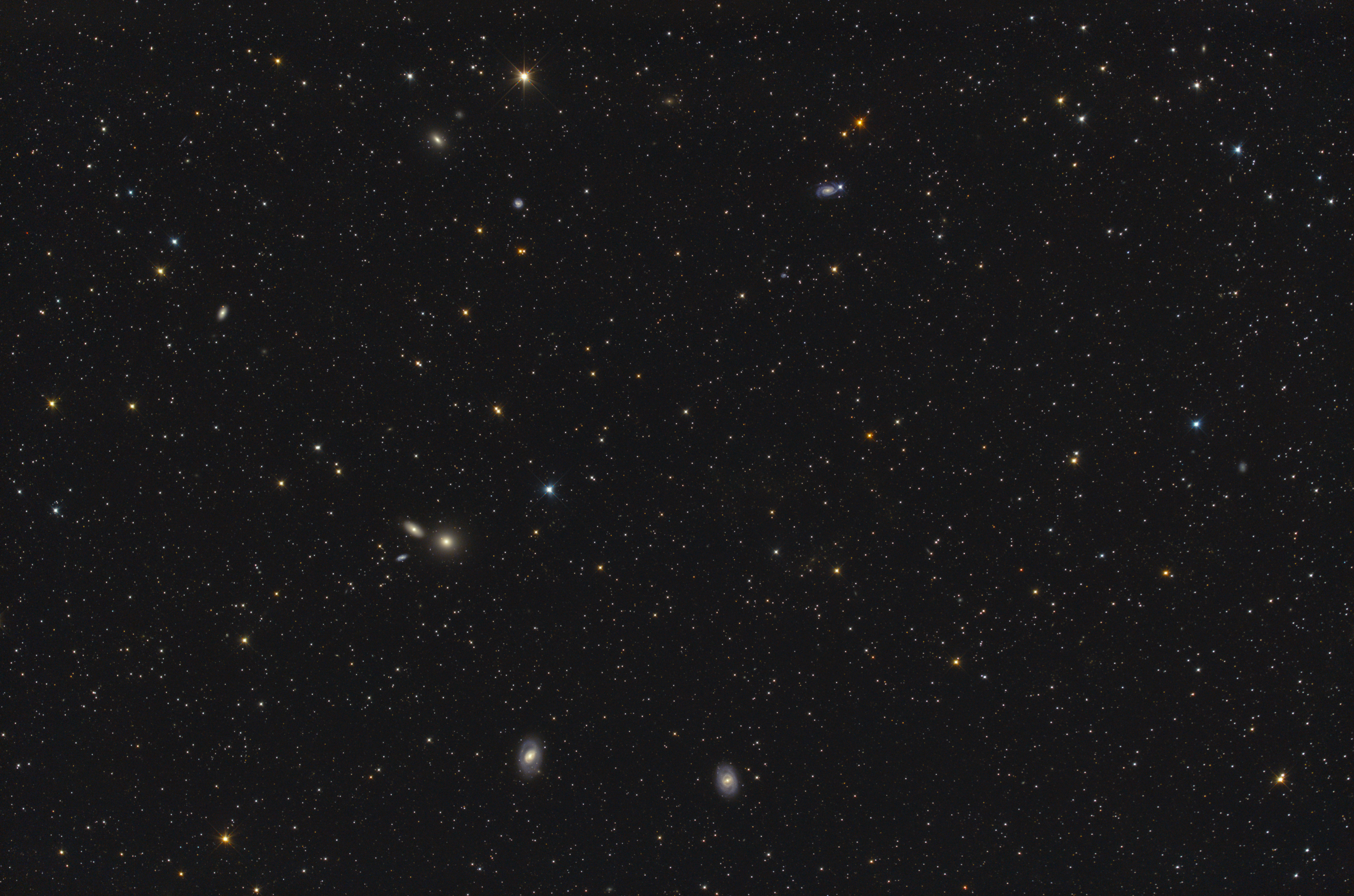 M 95 und M 96 sind Balken-Spiralgalaxien in etwa 36 Millionen Lichtjahren Entfernung. M105 ist etwa 37 Millionen Lichtjahre entfernt und gehört ebenso zur M96-Gruppe. Während die linsenförmige Galaxie NGC 3371 ein physischer Begleiter von M 105 ist, liegt die Spiralgalaxie NGC 3373 weit im Hintergrund.
