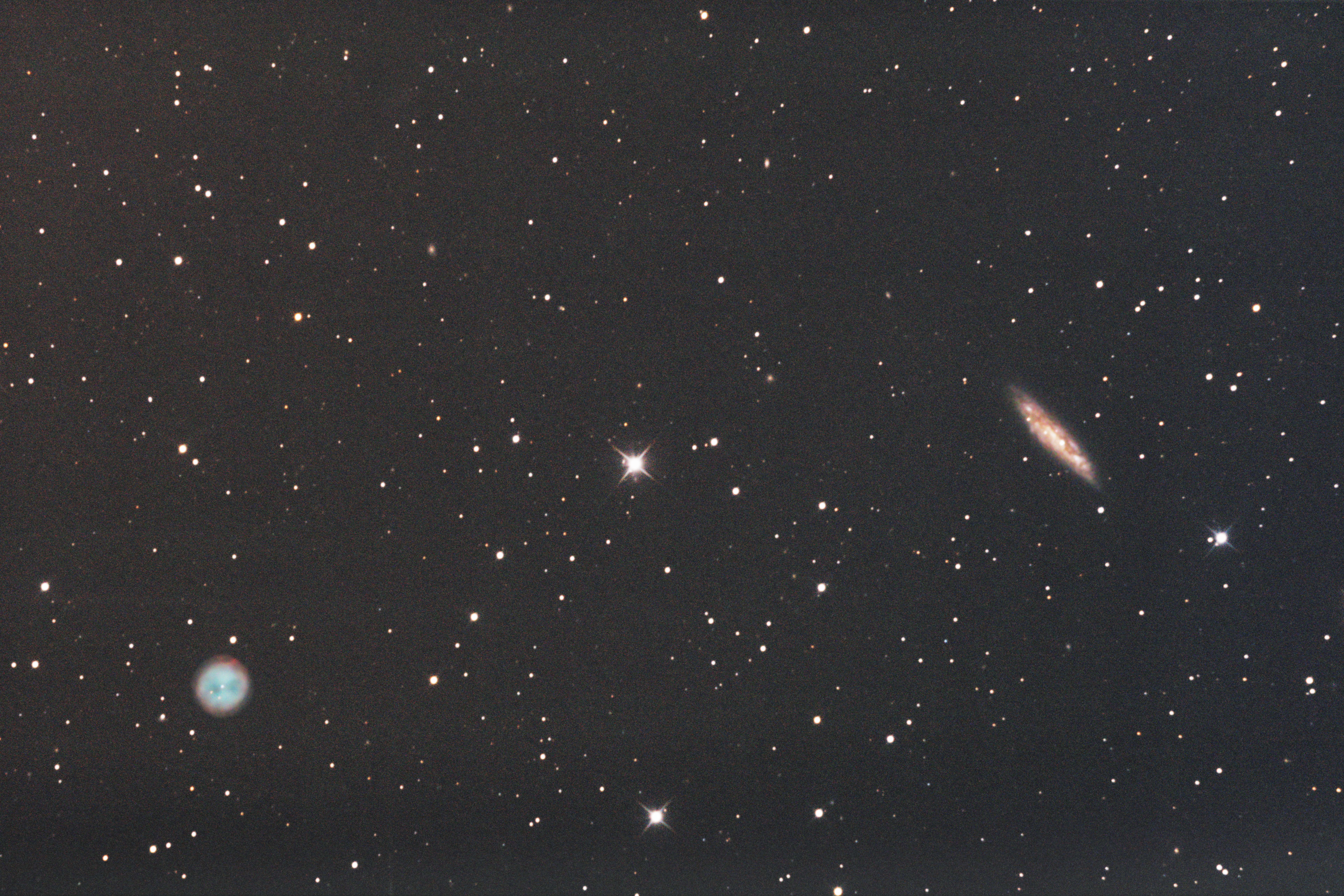 Das zweite Bild mit meinem neuen Acht-Zoll-Fotonewton mit f:5 zeigt Messier 97 und Messier 108, die gerade gemeinsam auf den APSC-Chip passen. Tatsächlich ist M 108 etwa zehntausend Mal weiter als der Eulennebel entfernt.