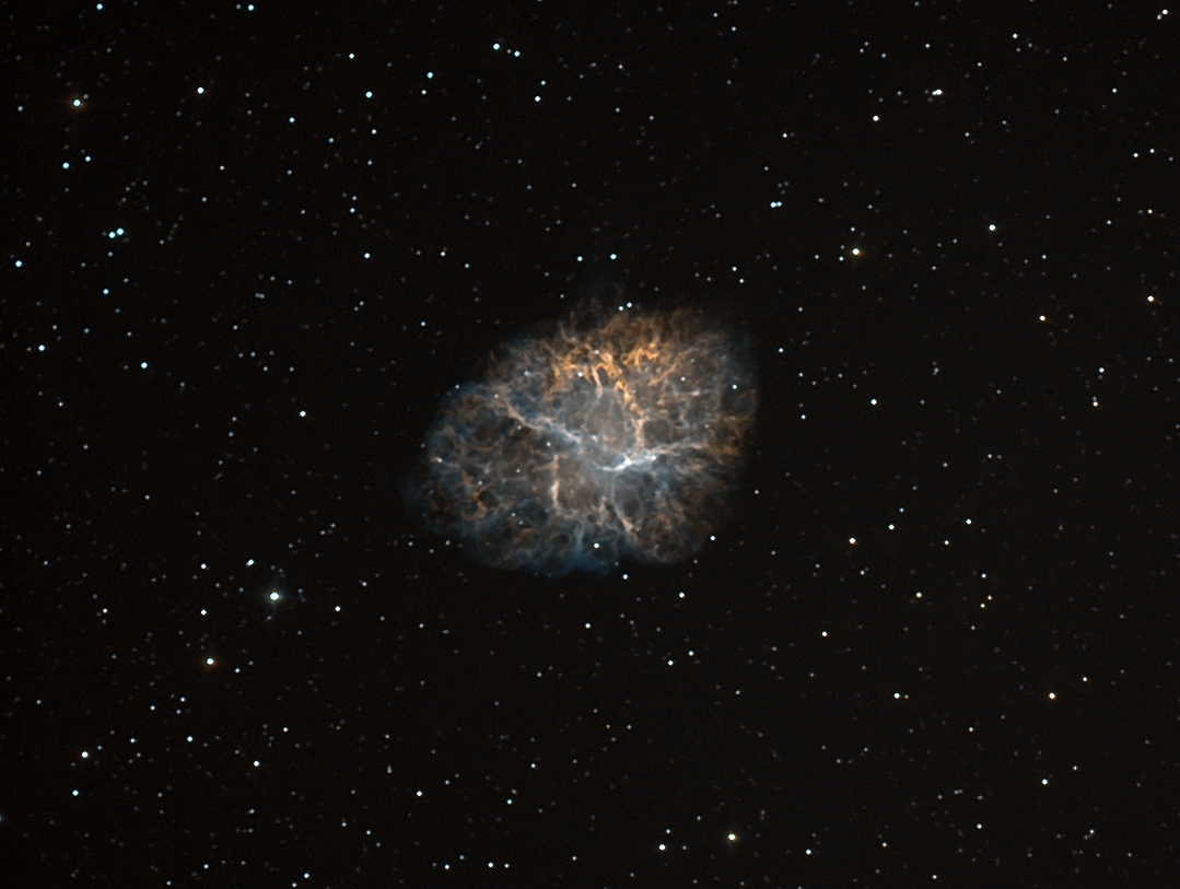 Nach einer langen Durststrecke endlich wieder ein Himmel mit guter Durchsicht. Bei diesem Bild handelt es sich um eine Bi-Color Variante des bekannten Krebsnebels. Beim Grün-Kanal handelt es sich um ein OIII+HA-Komposit.