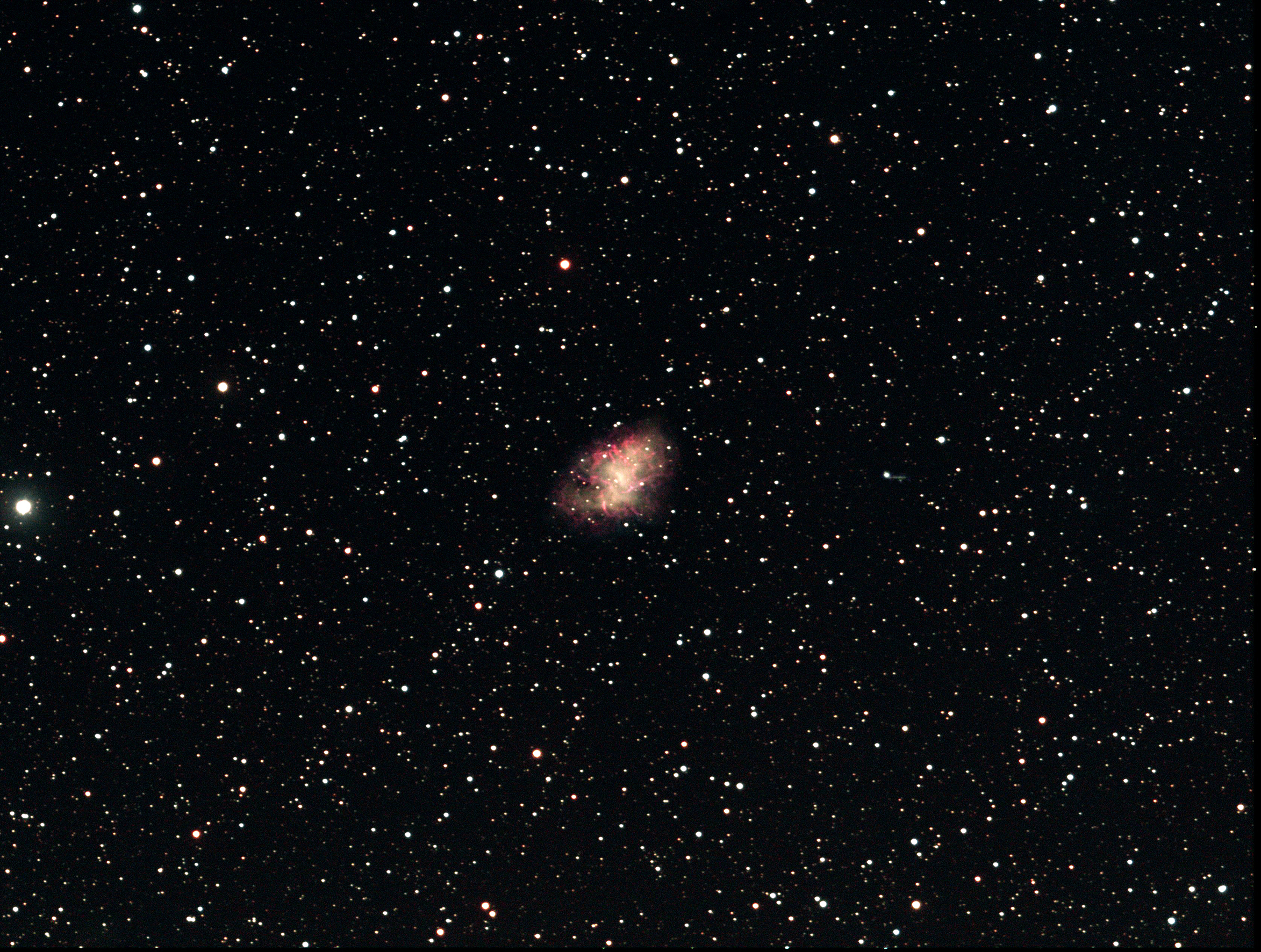 Auf dem Bild von M1 befindet sich auch die Strichspur des Kleinplaneten 2945 Zanstra (16,1m). Zu finden rechts von M1 ca. mittig zwischen dem Bildrand und M1. Die Spur startet dicht bei dem 13,5m hellen Stern 3UC225-038085.