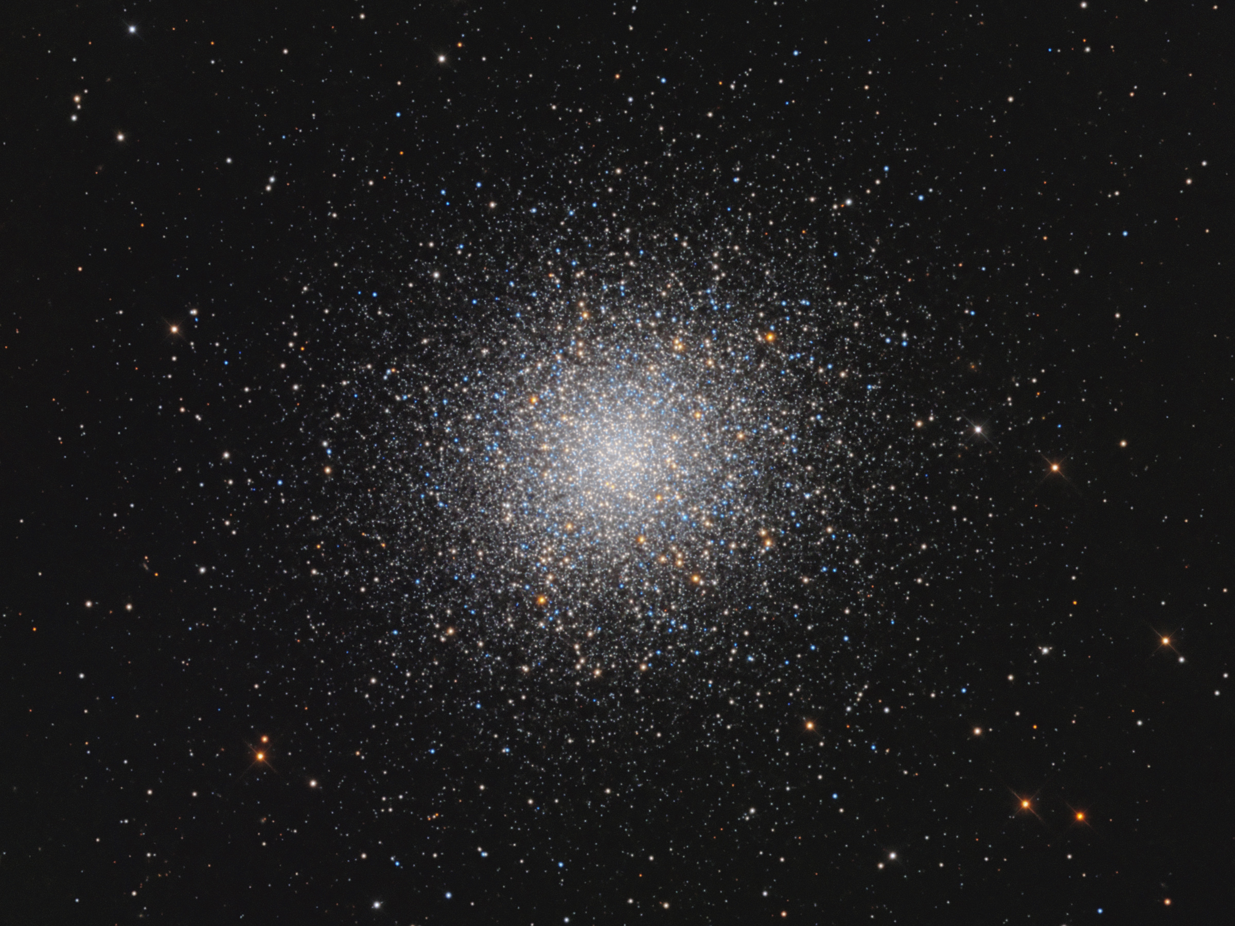M13 (NGC 6205) ist der hellste Kugelsternhaufen am nördlichen Himmel und ein dankbares Objekt für die hellen Sommernächte. Der sogenannte Herkuleshaufen steht in einer Entfernung von etwa 25000 Lichtjahren und umfasst etwa 500000 Sterne. M13 ist, wie schon erwähnt, ein recht helles Objekt am Himmel und erfordert von daher keine extrem langen Belichtungszeiten unter perfekt dunklem Himmel. Das Seeing sollte allerdings gut sein, möchte man die Sternenansammlung mit guter Winkelauflösung abbilden. Ich habe mein Newton-Cassegrain-Teleskop dafür mit dem ASA-Korrektor ausgestattet, welcher die Systembrennweite im Primärfokus auf 2070mm verlängert. Außerdem habe ich mich für die Belichtung ausschließlich in RGB entschieden und den Luminanzkanal ausgelassen.