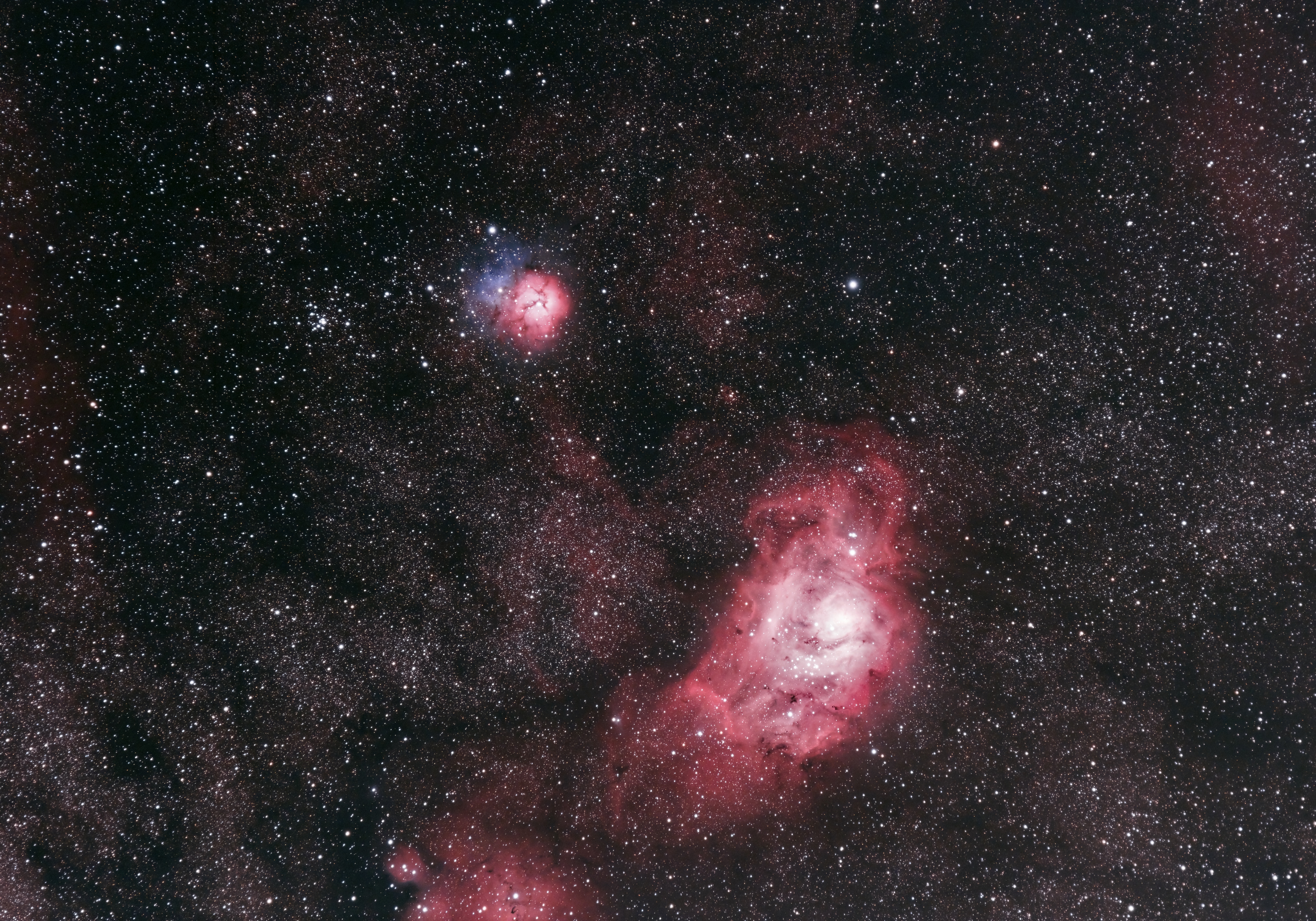 Der Trifidnebel M8 und der Lagunennebel M20 im Weitfeld. Sternentstehungsgebiete im Herz der Milchstraße. Leider stehen die beiden Objekte in unseren Breiten sehr tief am Horizont, daher waren zwei Nächte nötig, um RGB und LExtreme-Filterdaten zu bekommen.