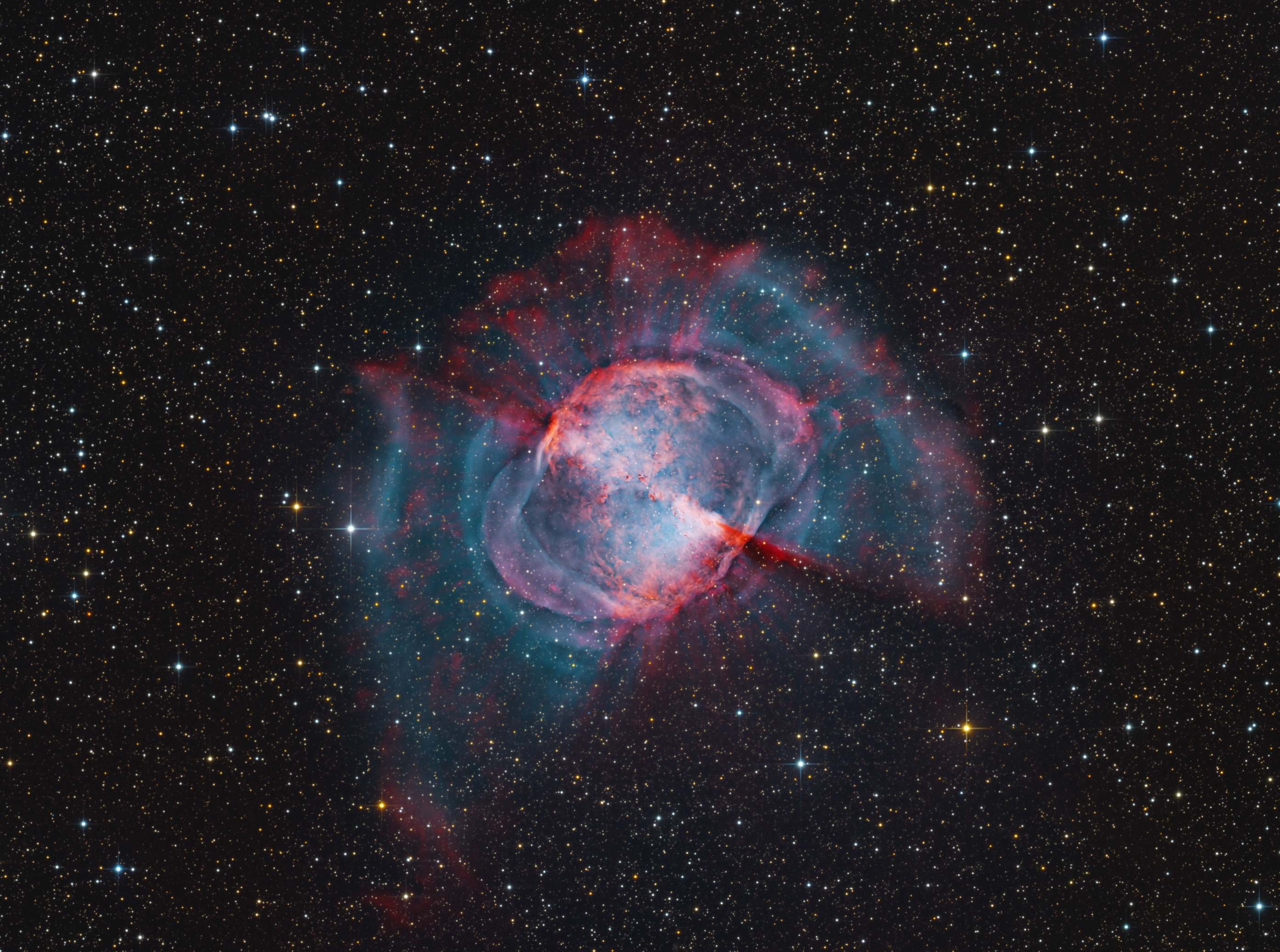 Einer der prächtigsten Objekte des Sommerhimmels ist der Planetarische Nebel Messier 27. Aber es ist nicht immer notwendig, alles neu zu belichten – manchmal hat man bereits wunderbare ( extrem lang belichtete) Daten im Archiv und es wartet eine Überarbeitung im Lichte der gegenwärtig rasanten Software-Entwicklung. Eine große Überraschung für alle im BTB-AstroTeam waren die Ergebnisse der Neubearbeitung der sommerlichen M27 Daten aus dem Jahre 2022 durch Manfred Wasshuber. Mit Hilfe von Drizzle und BlurXTerminator wurden Details sichtbar – die bisher nur von Großteleskopen (Very Large Telescope) gezeigt wurden. Wir konnten es zunächst nicht glauben und haben das Ergebnis mit Referenzen gewissenhaft überprüft. Alles real – keine Artefakte!
