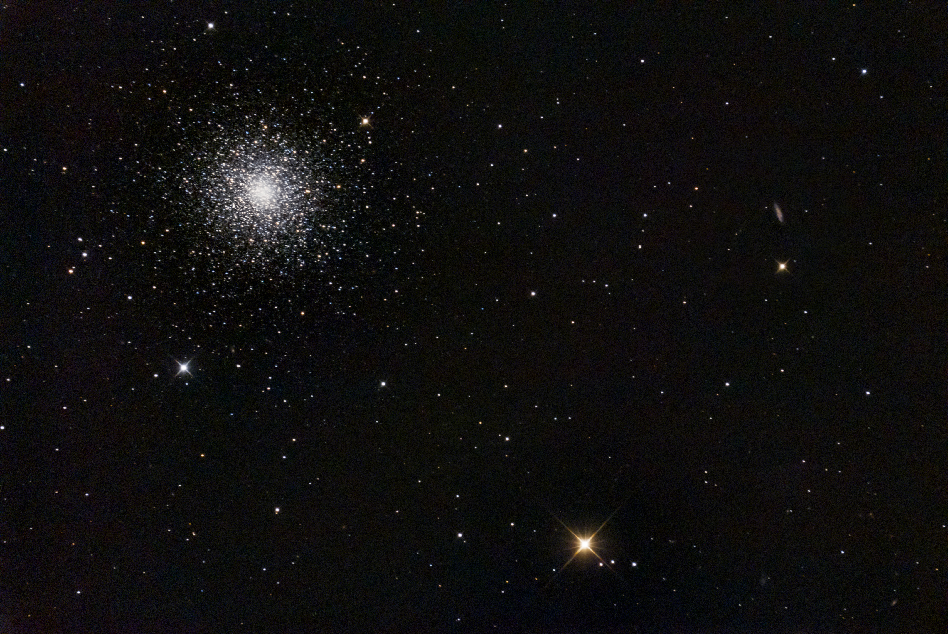 Der Kugelsternhaufen M3 und die Galaxie NGC 5263 (im rechten Drittel). Rechts unten finden sich noch zahlreiche weitere Galaxien aus dem Galaxienhaufen Abell 1769.