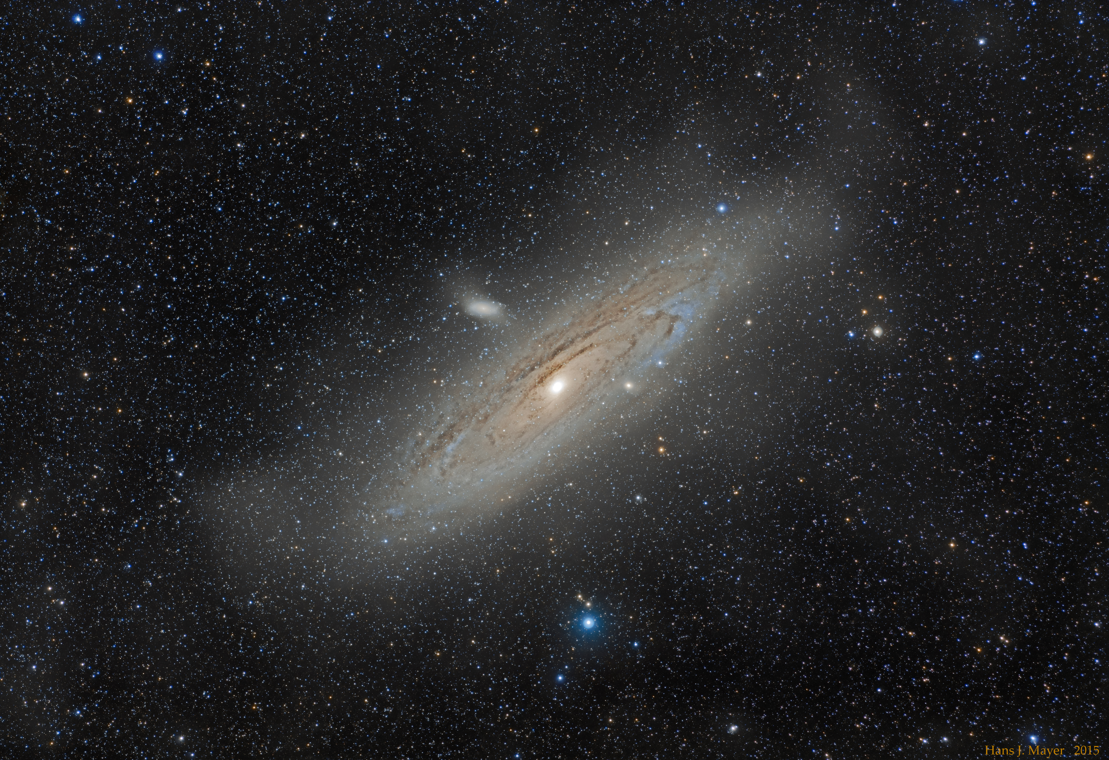 Tiefbelichtete Weitfeld-Aufnahme der Andromedagalaxis. Neben der wohlbekannten zentralen Scheibe konnten auch die helleren Bereiche des ausgedehnten stellaren Halos von M31 eingefangen werden.