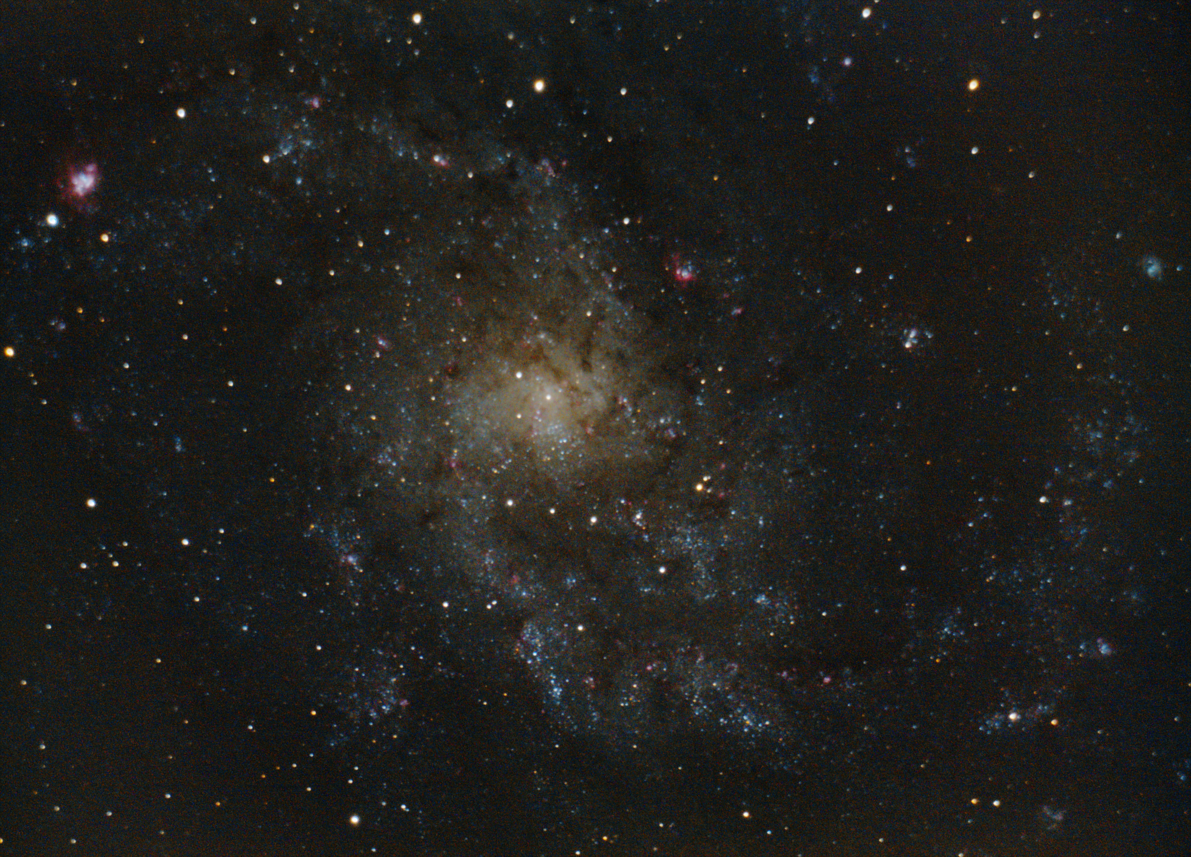 M 33 gehört wie M 31 und unsere Milchstraße zur Lokalen Gruppe. Sie ist allerdings kleiner und auch ärmer an Masse. Ich hatte im Nov. 2020 bereits einmal versucht, M33 zu fotografieren. Mit erneuerter Ausrüstung ergab sich diese Ergebnis.