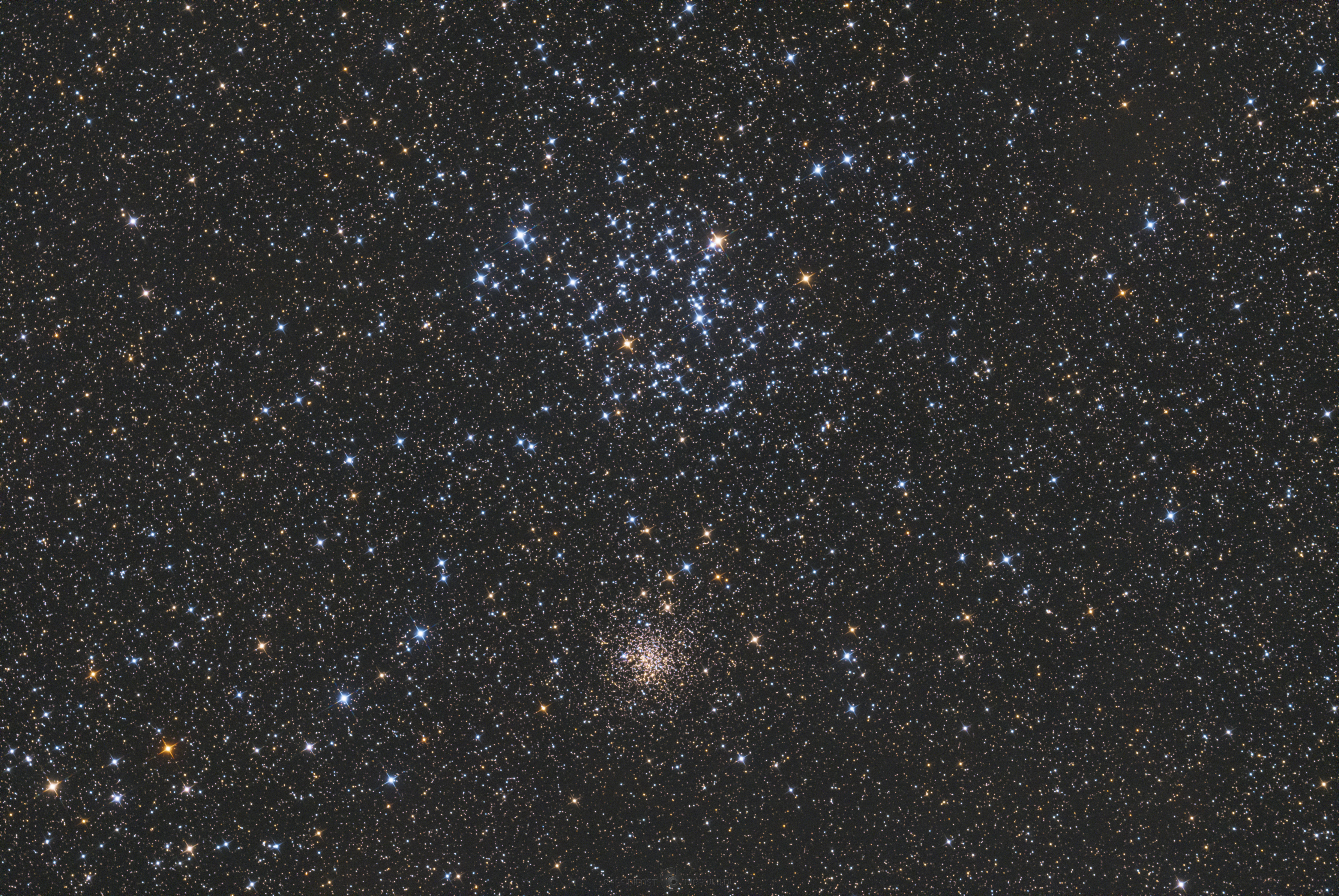 Die beiden offenen Sternhaufen Messier 35 (oben) und NGC 2158 (unten) im Sternbild Zwillinge könnten unterschiedlicher kaum wirken. M35 liegt etwa 2800 Lichtjahre von der Erde entfernt während NGC 2158 deutlich weiter entfernt ist. Dessen Sterne sind stark konzentriert, ähnlich wie bei einem Kugelsternhaufen. Aufgrund seines vergleichsweise geringen Alters lässt er sich aber eindeutig als offener Sternhaufen klassifizieren.