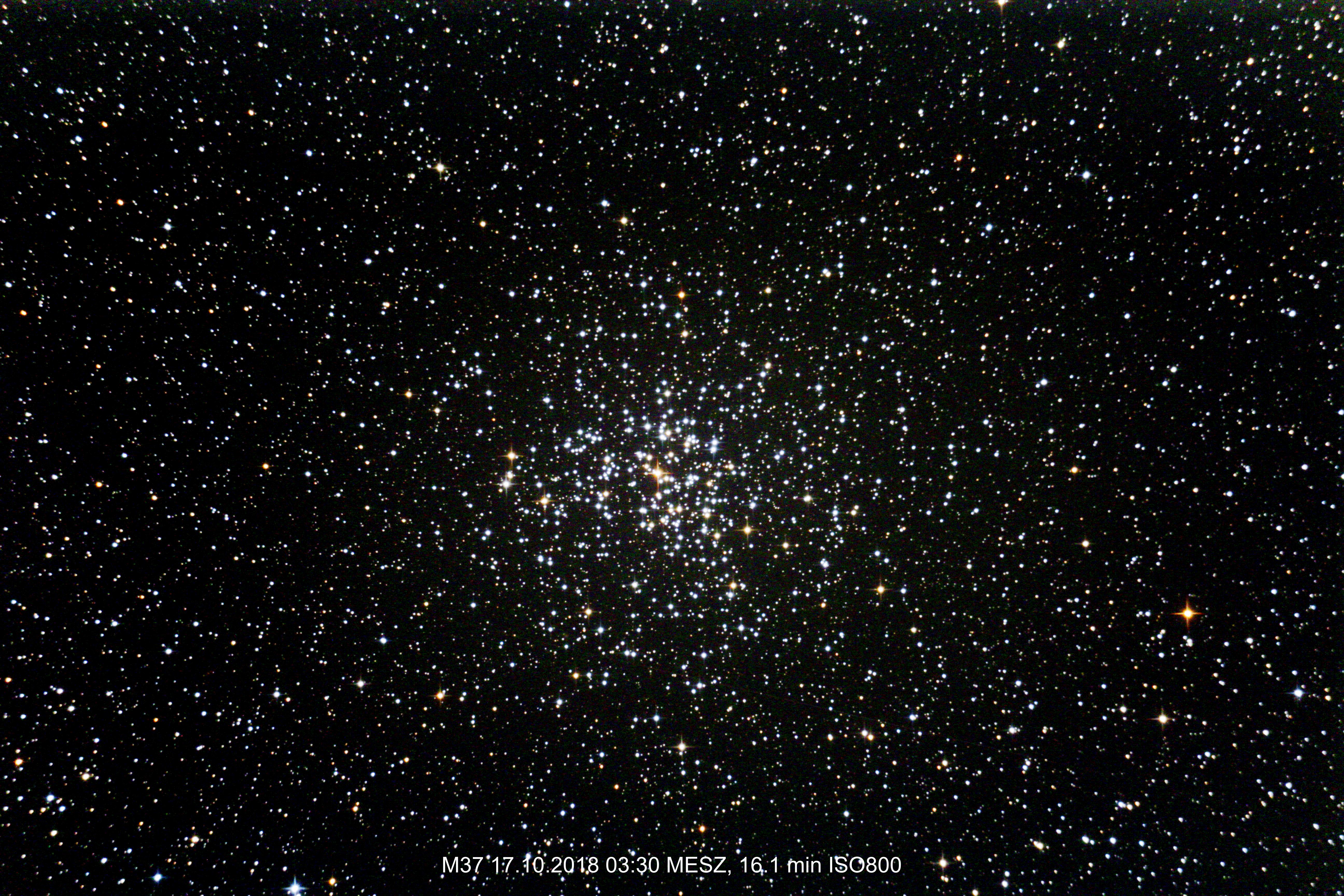 Sehr eindrucksvoll in nahezu jedem Teleskop ist der sternreiche offene Sternhaufen Messier 37 im Fuhrmann. Der kompakte Haufen mit mehr als 2000 Sternen bietet vor den Hintergrund der Milchstraßensterne ein sehr eindrucksvolles Bild sowohl visuell als auch fotografisch. Die Verteilung der Sterne erscheint dreieckig, die Spitze des Dreiecks zeigt nach Osten. Fotografiert mit Canon EOS 700Da 4 x 4 min bei ISO 800 fokal am 10-Zoll-Newton mit 1,4 Meter Brennweite.