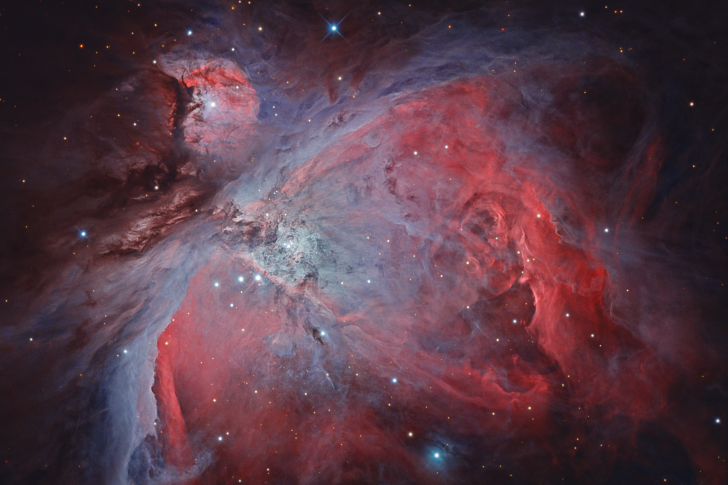 Der Orionnebel gehört sicher zu den am meisten abgelichteten Deep-sky-Objekten überhaupt und daher verzichte ich auf eine detaillierte Beschreibung des Objekts. Meine letzte Aufnahme von M42 liegt nun schon viele Jahre zurück und für mich war es ein Anreiz, die Dynamik meiner neu erworbenen CMOS-Kamera daran zu testen. Bekanntermaßen ist es immer besonders schwierig, den großen Helligkeitsumfang vom Zentralbereich, um die Trapezsterne herum, bis zu den schwachen Randbereichen gemeinsam in einer Aufnahme darzustellen. Eine gängige Technik ist hierfür die Kombination von Kurz- und Langzeitbelichtungen, das sogenannte HDR (High Dynamic Range). Ich hingegen, wollte mit einer Sequenz mit nur einer Belichtungszeit, möglichst den gesamten Dynamikbereich der Kamera von > 14 Blendenstufen ausschöpfen. Für die Einzelbelichtungen pro RGB-Frame habe ich 60s gewählt. Eigentlich hätte ich noch kürzer belichten sollen, da die hellsten Trapezsterne in den einzelnen Farbkanälen bereits ausgebrannt waren. Doch diesen Kompromiss bin ich für meinen Versuch eingegangen. Die Bearbeitung erfolgte durch nichtlinearen Stretch der Daten mit dem DDP-Filter in AstroArt, in Kombination mit der Maskentechnik in PhotoShop. Leider spielte das Seeing bei der vergleichsweise geringen Horizonthöhe nicht so recht mit und so lagen die FWHM-Werte bei über 2,7 Bogensekunden, was bei meiner langen Aufnahmebrennweite schon zu deutlichem Detailverlust führt. Dennoch bin ich mit dem Ergebnis, was die Dynamikbewältigung betrifft, recht zufrieden.