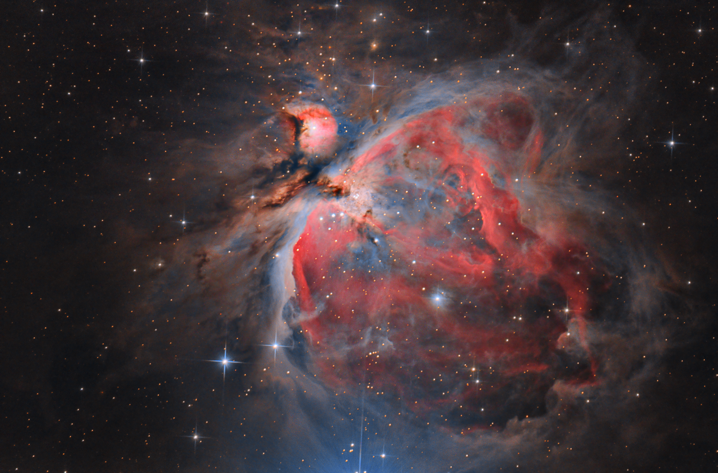 Eigentlich hatte ich vor, im Jänner 2018 nochmals den Orionnebel aufzunehmen, aber das Wetter machte mir bis jetzt einen Strich durch die Rechnung. So suchte ich meine alten Daten aus 2015, damals war ich blutiger Anfänger, und versuchte das Objekt mit meinem derzeitigen Wissensstand der Bildbearbeitung neu zu verarbeiten. Ich konnte das Maximum bei dieser eigentlich sehr kurzen Gesamtbelichtung herausholen. Den Fokus legte ich auf die gute Sichtbarkeit der extrem hellen Nebelanteile im Zentrum, was mit der HDR-Technik gut zu schaffen war.