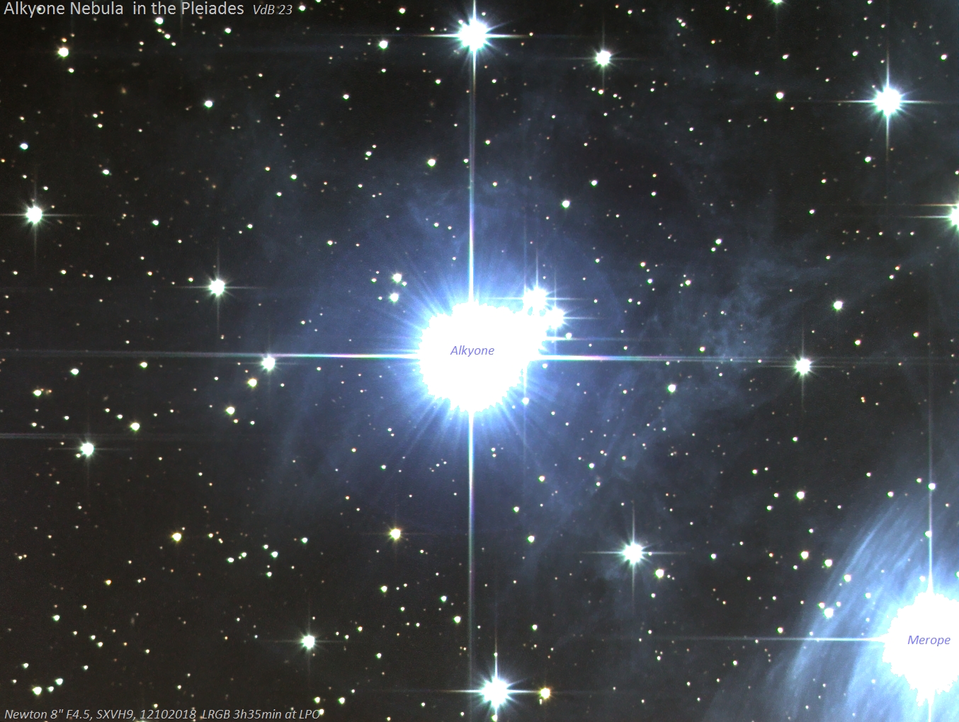 VdB23, Reflexionsnebel um Alkyone. Um die Nebelstrukturen gut