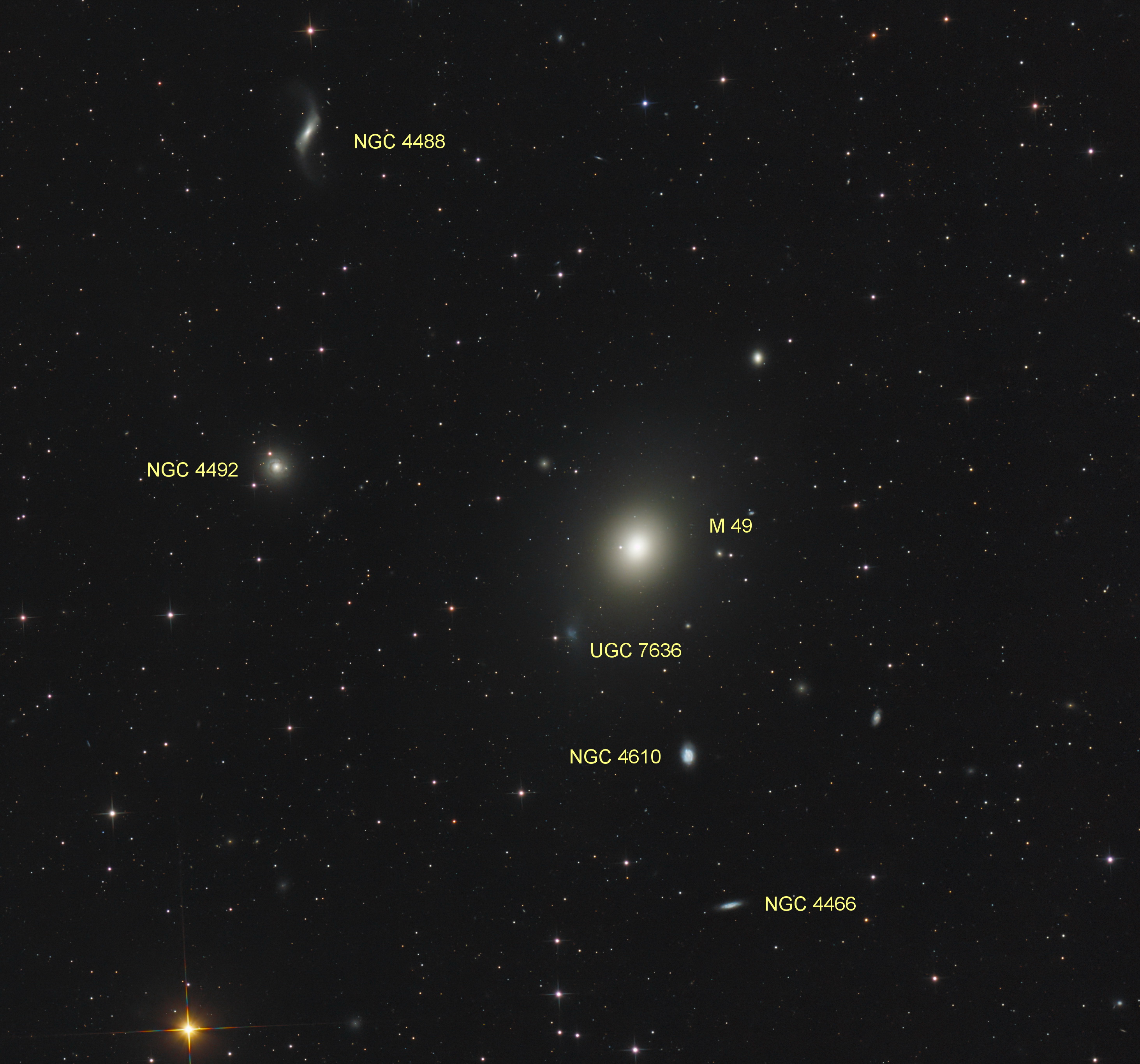 Messier 49 ist eine elliptische Galaxie im Sternbild Jungfrau auf der Ekliptik. Gemeinsam mit der irregulären Galaxie UGC 7636 bildet diese einen Eintrag im Arp-Katalog (Arp 134). Halton Arp gliederte seinen Katalog ungewöhnlicher Galaxien nach rein morphologischen Kriterien in Gruppen. Diese Galaxie gehört zu der Klasse der Elliptischen Galaxien mit nahen Fragmenten (Arp-Katalog). Messier 49 war die erste Galaxie des Virgo-Galaxienhaufens, die gefunden wurde. Entdeckt wurde sie am 19. Februar 1771 vom französischen Astronomen Charles Messier. M49 ist zudem das hellste Mitglied dieses Galaxienhaufens, der etwa 41 Millionen Lichtjahre entfernt ist.