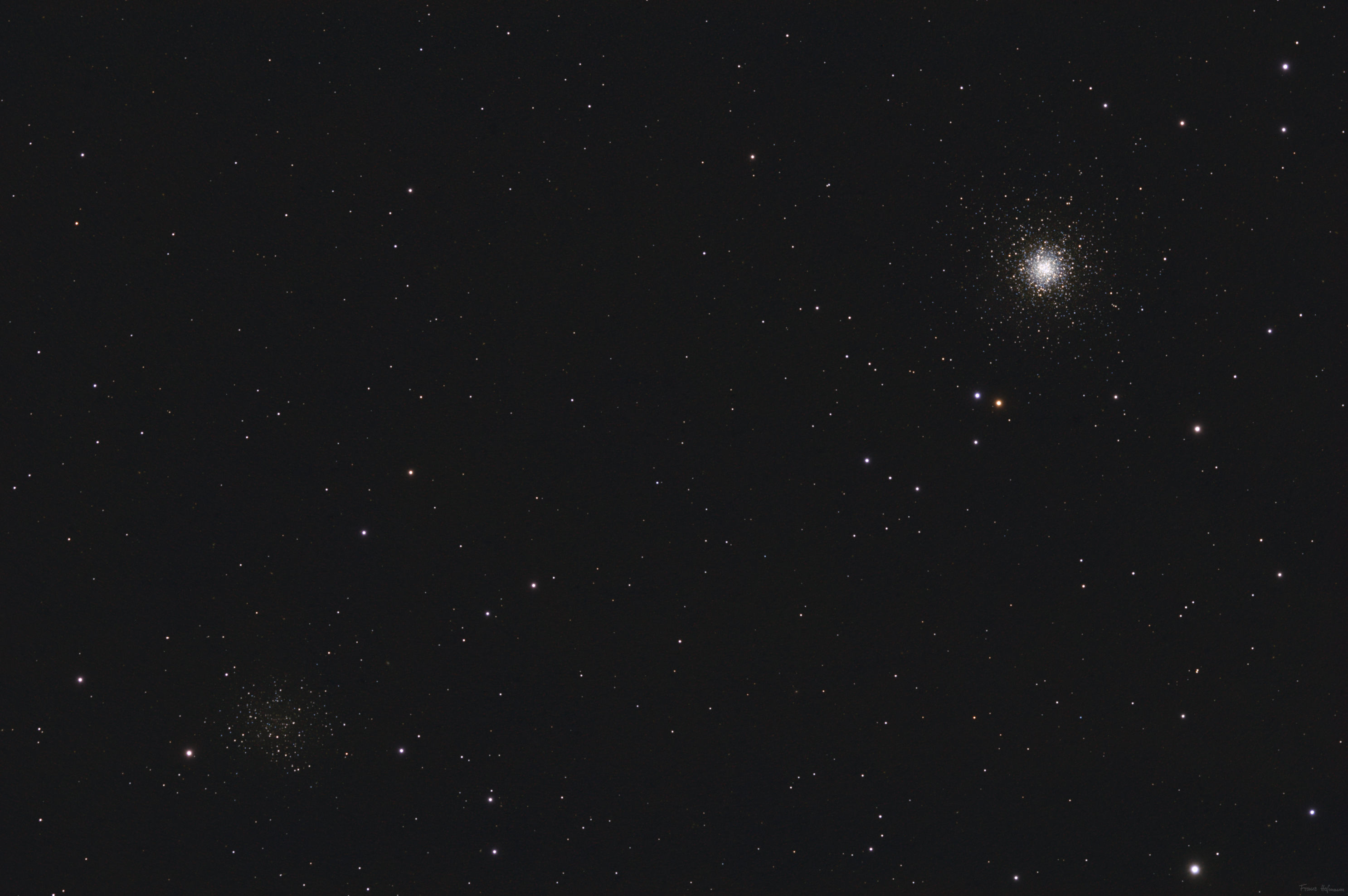 In nahezu gleicher Entfernung und mit fast gleichem scheinbaren Durchmesser stehen diese beiden Kugelsternhaufen jedoch wie zwei ungleiche Zwillinge am Himmel