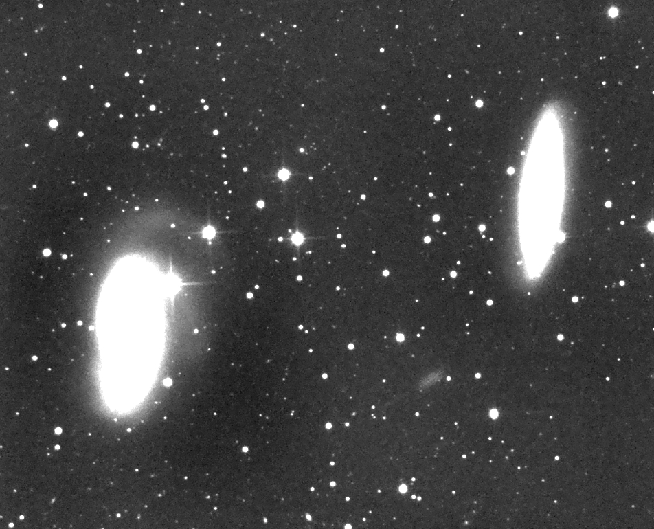 Dies ist eine Aufnahme vom Galaxienpaar M65 und M66, dem südlichen Teil des Leo-Tripletts. Nur in Luminanz bei fünf Stunden Belichtungszeit! Bemerkenswert sind die Detailfülle in den Spiralarmen, und obwohl nur mit meinem 6-Zoll/F5 aufgenommen, ähnelt es sehr den Aufnahmen, die mit dem 5-Meter-Hale-Teleskop in den 1960er Jahren aufgenommen wurden! M66 trägt auch die Bezeichnung Arp 16. Dies ist eine stark kontrastverstärkte Aufnahme, bei der die Gesamtausdehnung von M66 erst richtig sichtbar wird! Wer ist für die asymmetrische Form der Spiralarme und der Gezeitenströme verantwortlich? Ist es M66, NGC 3628 (Arp317) oder die kleine anonyme Zwerggalaxie (Pfeil)? Wo gibt es eine Antwort auf diese Frage?