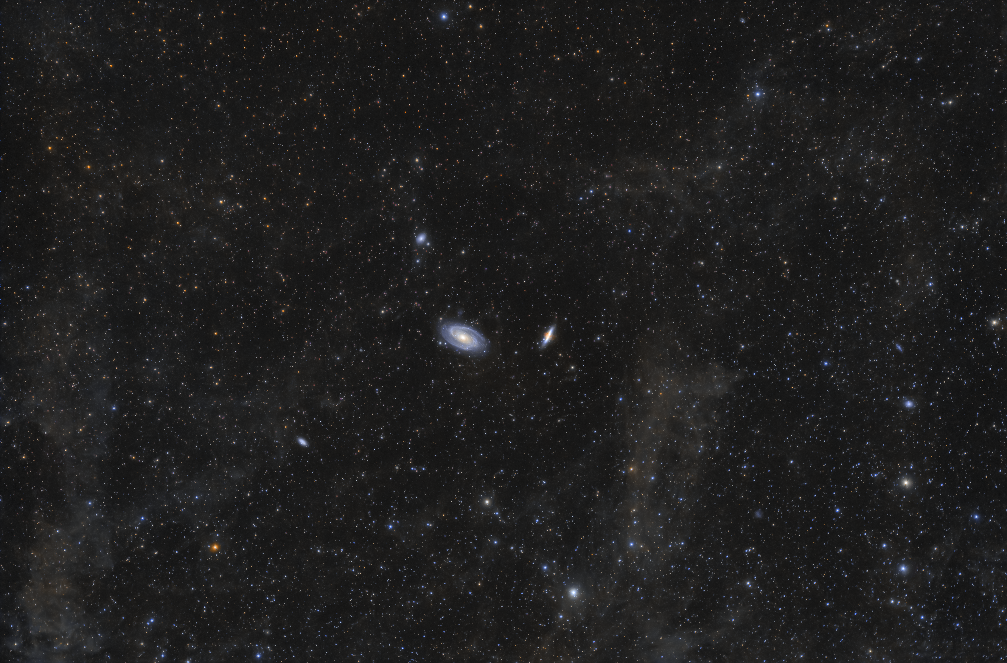 In Richtung der Galaxiengruppe um M81 sehen wir durch zarte Wolken interstellarer Materie hindurch, die ich in dieser sehr lang belichteten Weitfeldaufnahme trotz Stadtnähe gut sichtbar machen konnte.