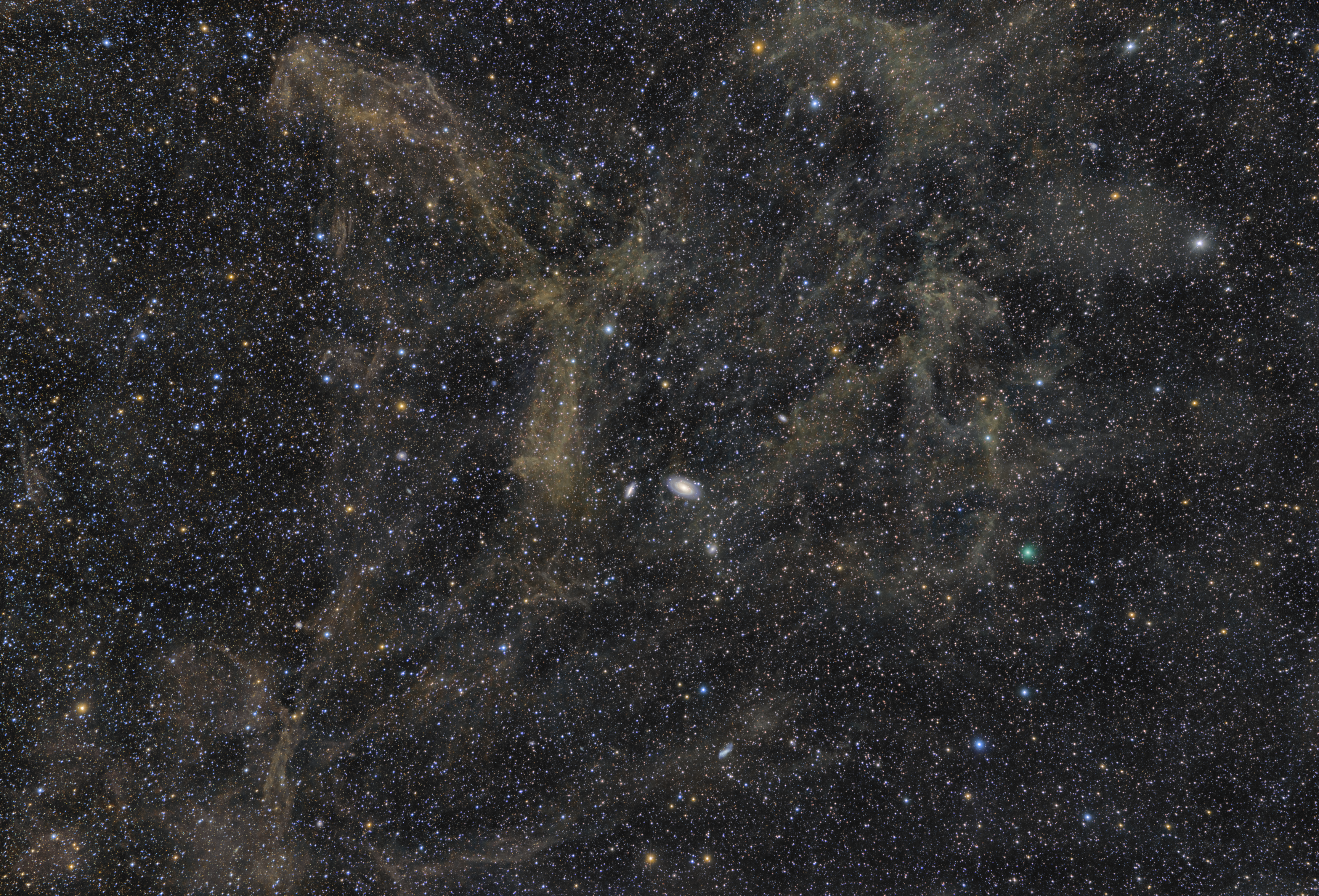und fand dann 730 Subframes zu 2 min vor - mit über 24 h Belichtungszeit meine längste Belichtung bisher. Ziel war, die Staubaschwaden des IFN welche sich beim Paar M81/82 durchs Feld ziehen gut darstellen zu können. Durch Zufall zog bei den Sessions der noch heile Komet Atlas nahezu unscheinbar durchs Feld (abgesehen vom charakteristischen Grün), und so vereinigt das Bild einige Dimensionen der Entfernungsskala in sich. https://www.astrobin.com/bo74d5/