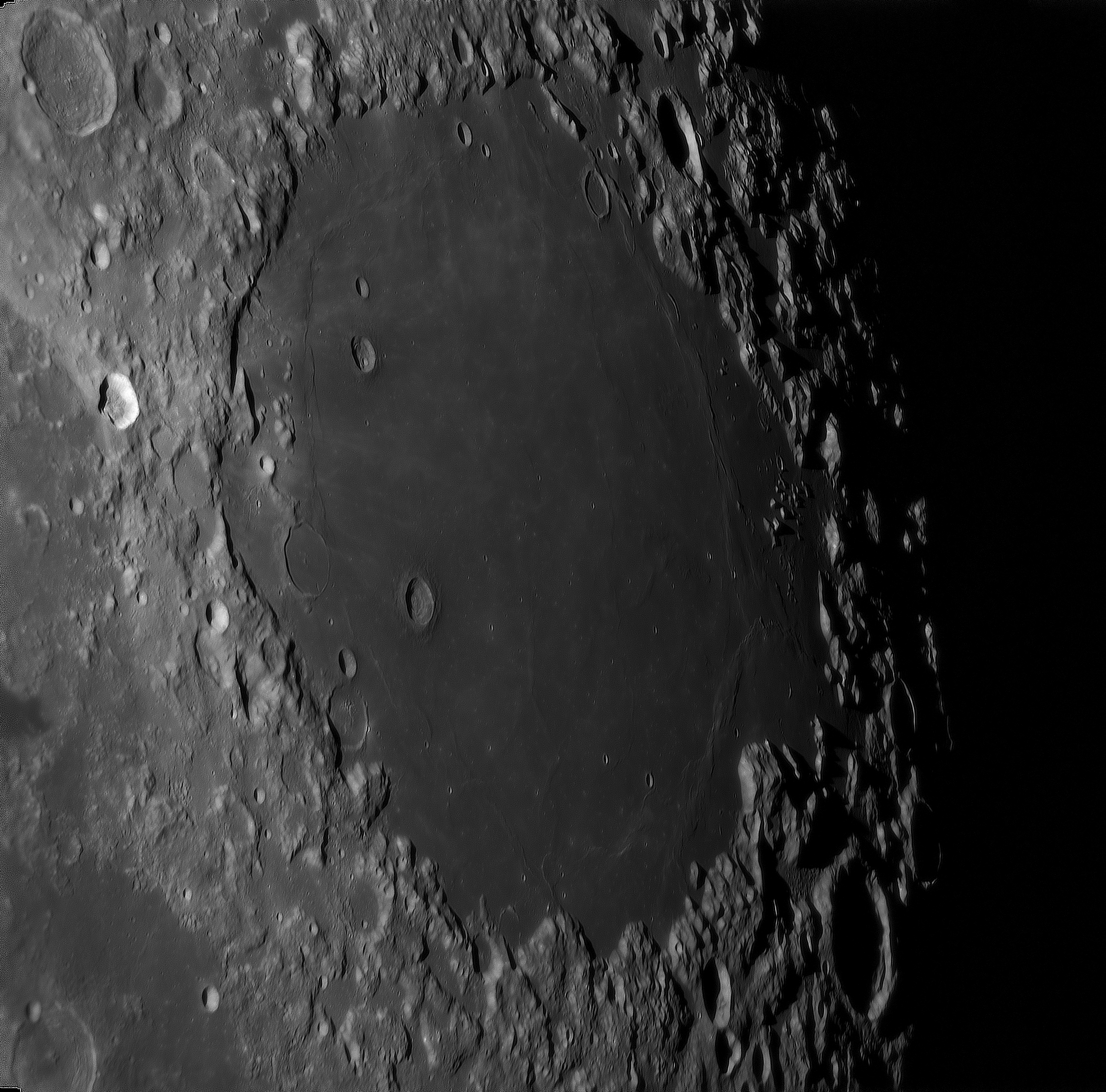 In hoher Auflösung zeigt sich eine überraschende Vielfalt an Details: feine Strukturen im dunklen Lavaboden, zahlreiche kleine Einschlagskrater sowie der markante, steil abfallende Randwall des Beckens. Das Mare Crisium entstand vor etwa 3,9 Milliarden Jahren durch einen gewaltigen Meteoriteneinschlag und wurde später von erstarrter Lava aufgefüllt.