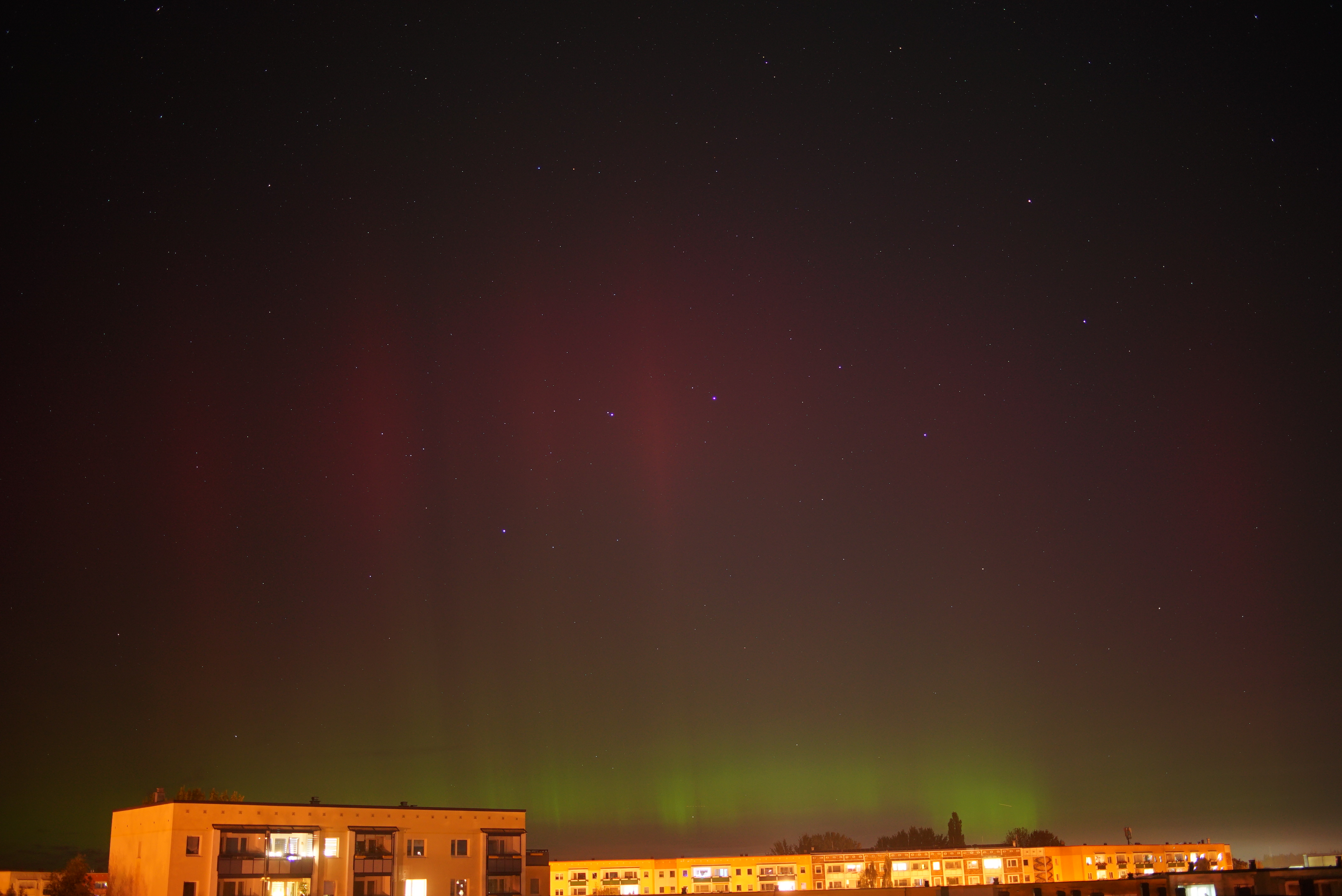 Während zunächst Komet Lemmon am Abendhimmel ins Visier genommen wurde, schien der Nordhorizont leicht aufgehellt. Und in der Tat stellte sich bald heraus, dass Polarlichter aktiv waren, welche mitunter bei mir unter Stadtteilbedingungen mit Kunstlicht deutlich visuell erschienen - jedoch farblos. Anders sah es die Kamera. Zum grünen Bogen gesellten sich mitunter diffuse Flecken, welche zu pulsieren schienen (RAGDA) und wiederholt auch Strahlen, wie hier gezeigt. Das Polarlicht war mindestens von vor 18:50 bis mindestens 01:50 UT fotografisch nachweisbar.