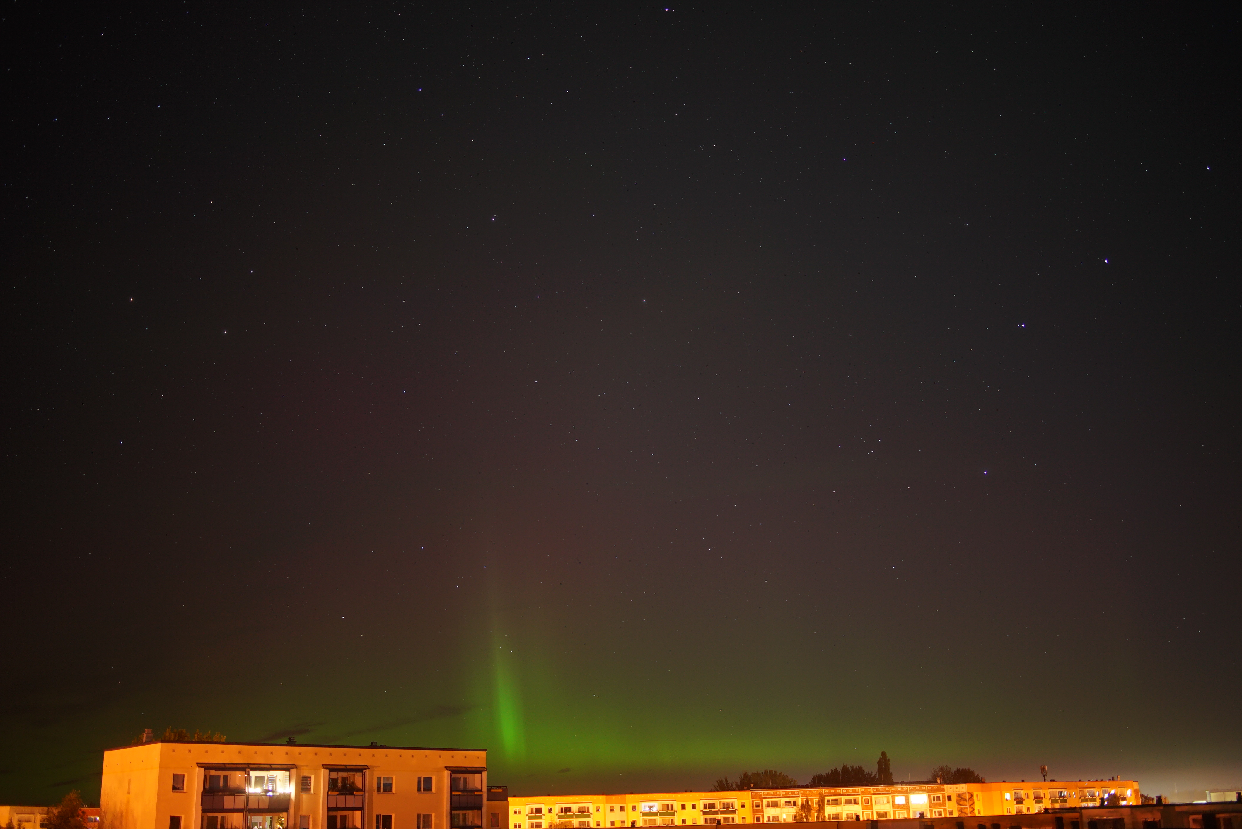 Während zunächst Komet Lemmon am Abendhimmel ins Visier genommen wurde, schien der Nordhorizont leicht aufgehellt. Und in der Tat stellte sich bald heraus, dass Polarlichter aktiv waren, welche mitunter bei mir unter Stadtteilbedingungen mit Kunstlicht deutlich visuell erschienen - jedoch farblos. Anders sah es die Kamera. Zum grünen Bogen gesellten sich mitunter diffuse Flecken, welche zu pulsieren schienen (RAGDA) und wiederholt auch Strahlen, wie hier gezeigt. Das Polarlicht war mindestens von vor 18:50 bis mindestens 01:50 UT fotografisch nachweisbar.