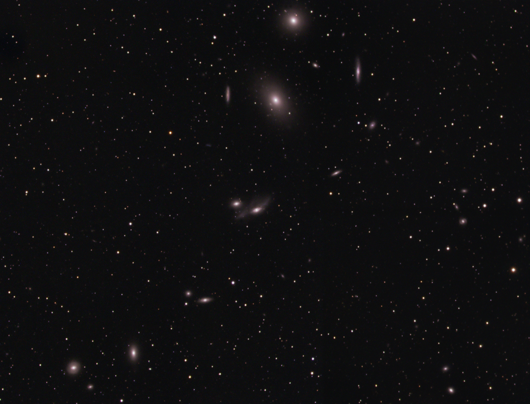 Da ich am 7.3.2011 ein wenig auf IC 443 "rumbelichtet" habe und nach dessen Verschwinden hinter Nachbars Haus noch etwas Nacht übrig war, habe ich ein wenig in den Virgohaufen gehalten und Markarians Chain mit 4 x 10 min pro Kanal aus meinem lichtverseuchten Garten belichtet. Als Teleskop diente mein kleiner Takahashi FS78 bei f/6 mit meiner SBIG ST8300M auf der CGE Pro. Brennweite und Belichtungszeit sind natürlich nicht erste Wahl für Galaxien, aber besser als die klare Nacht ungenutzt verstreichen zu lassen...