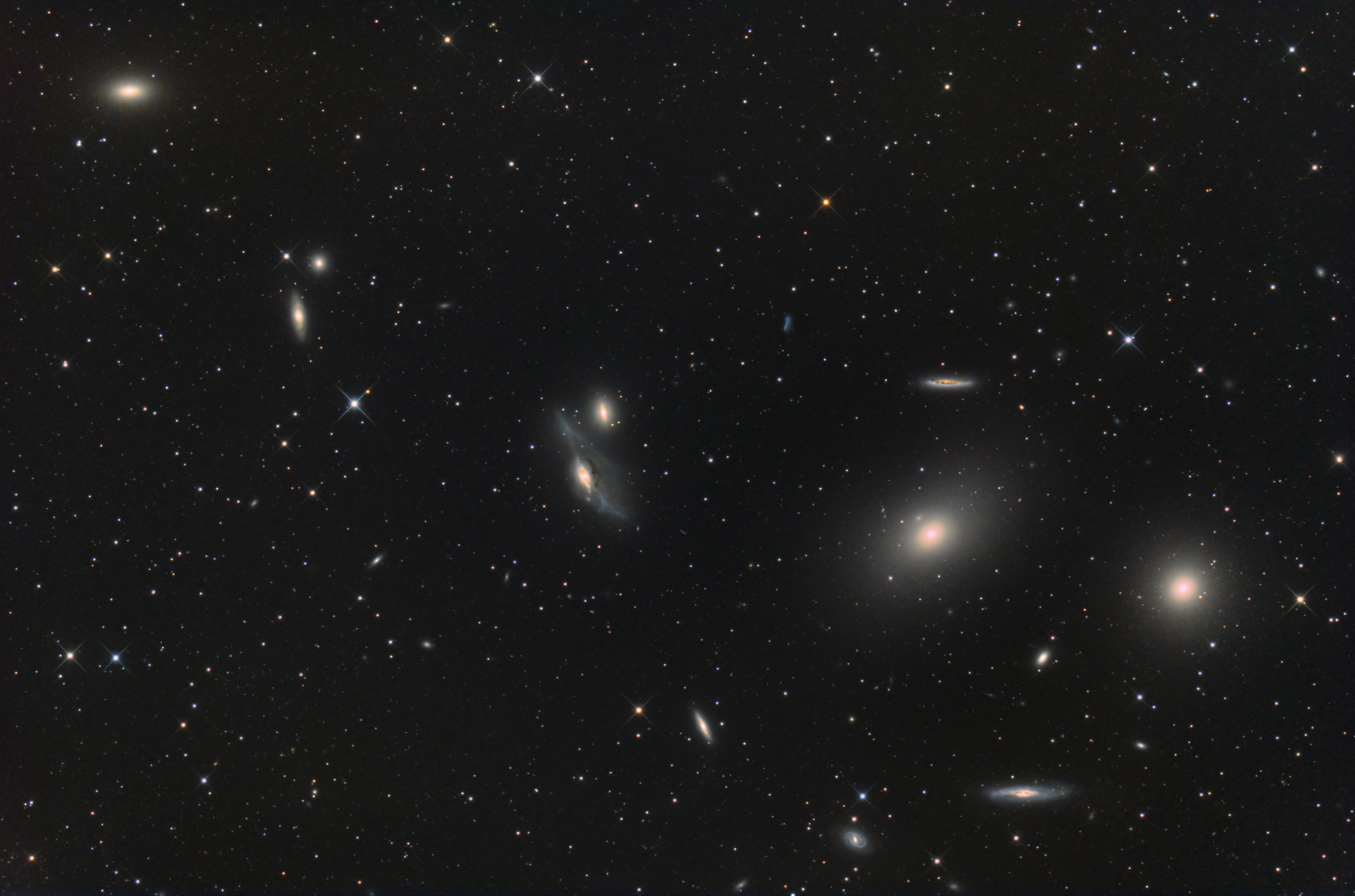 Der Virgo-Haufen ist der uns am nächsten liegende Galaxienhaufen mit einem Durchmesser von rund 13 Millionen Lichtjahren. Er umfasst rund 160 größere elliptische oder spiralige Galaxien und rund 2000 kleinere Galaxien in einer Entfernung von rund 54 Millionen Lichtjahren. Die drei Riesengalaxien Messier 84 (rechter Bildrand), Messier 86 (links neben M 84) und Messier 87 (nicht am Bild) bilden das Zentrum des Haufens. Bei M 86 beginnt die nach links oben verlaufende Markarians Galaxienkette, die aus den NGC-Galaxien 4435, 4438, 4458, 4461 und 4473 und einigen IC-Galaxien besteht. Gleichzeitig ist der Virgo-Galaxienhaufen auch das Zentrum des lokalen Superhaufens, der daher auch Virgo-Superhaufen genannt wird. Die Schwerkraft reicht über die Lokale Gruppe, zu der auch unsere Milchstraße gehört, hinaus. Dies ist auch der Grund, warum unsere Milchstraße mit 100 bis 400 Kilometer pro Sekunde auf den Virgo-Galaxienhaufen stürzt (virgo-centric flow).