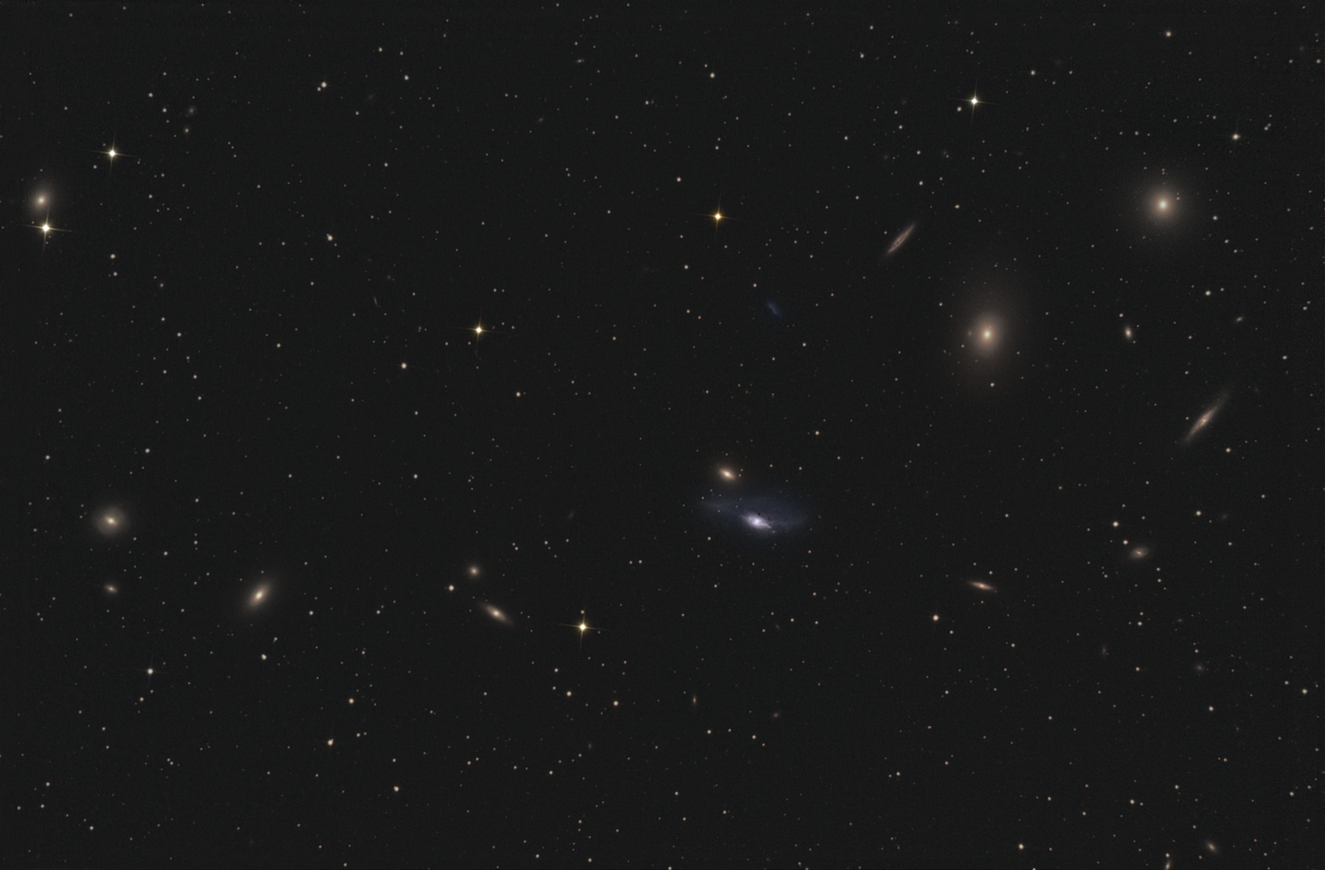 Diese mit Galaxien übersähte Aufnahme entstand in 8 Nächten von meiner Balkonsternwarte aus, da mir nur ein zweistündiges Zeitfenster pro Aufmahmenacht zur Verfügung steht. Ohne jeglichen Aufnahmefilter war die Bildbearbeitung nicht weniger spannend als die Bildgewinnung. Dass die Temperaturen in diesen Nächten relativ gleichbleibend waren, vereinfachte es ein wenig, ein homogenes Bild zu schaffen.