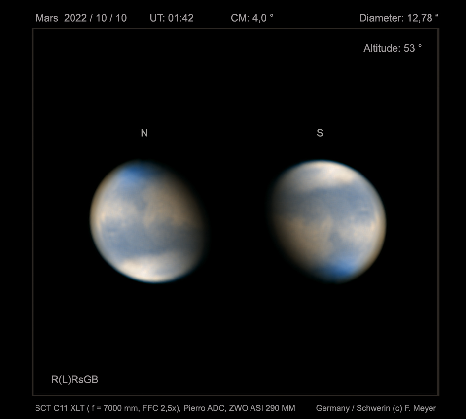 Angaben im Bild. Von 90 sec Videos im RGB mit je ca. 4000 bis 10000 Frames wurden pro Kanal 33 % für die weitere Bildbearbeitung genutzt. Die Auswirkungen des Staubsturms sind besonders im Süden des Planeten erkennbar. Im Norden ist die bläuliche Polhaube auffällig.