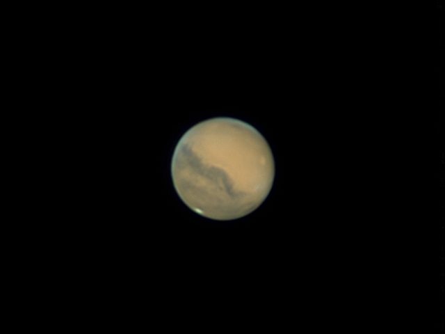 Nachdem es nahe der Marsopposition bisher fast nur bewölkt war, gab es nun doch ein paar Wolkenlücken und vergleichsweise gutes Seeing. Am rechten Bildrand etwas oberhalb der Bildmitte erkennt man Olympus Mons, den höchsten Berg im Sonnensystem.