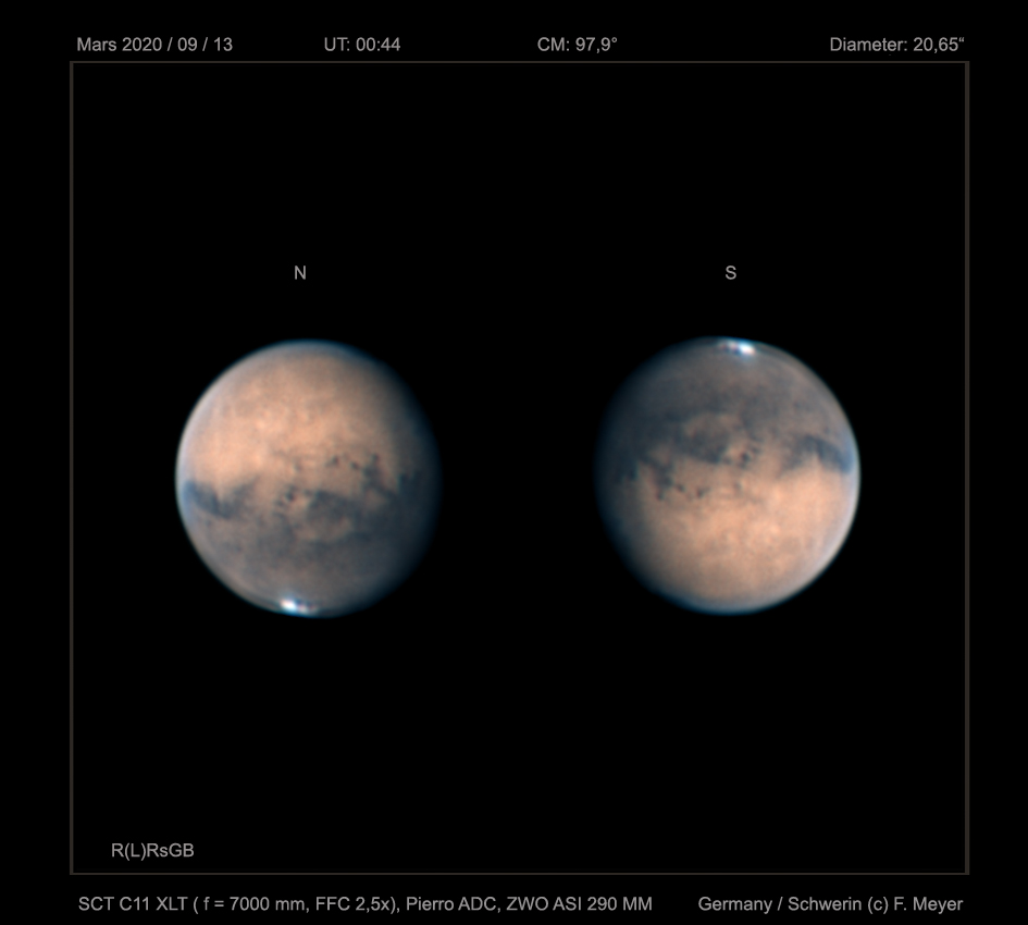 Der Mars zeigte am 13. September 2020 gegen 02:44 Uhr MESZ in einem SCT C11 schöne Details. Das "Marsauge" Solis Lacus, das Canon - System Vallis Marineris und die Tharsis - Vulkane sind erkennbar. Von je 2 min Videos pro Farbkanal mit 8000 bis 13000 Frames wurden 33% für die weitere Bildbearbeitung genutzt. Aufnahmesoftware war FireCapture.
