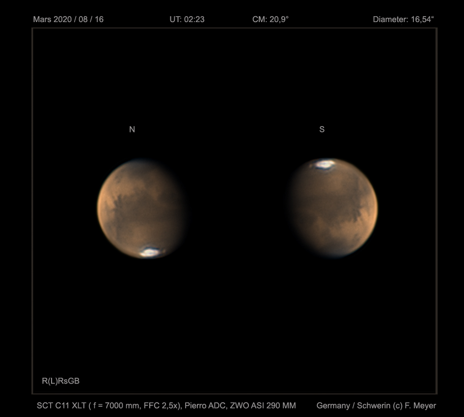 Bei recht guten Aufnahmebedingungen konnte ich am Morgen des 16. August 2020 den Mars mit FireCapture aufnehmen. Von 2 min Videos des Rot- und Blaukanals mit 13000 bis 5000 frames wurden 33% der Einzelbilder genutzt. Der Grünkanal ist synthetisch.