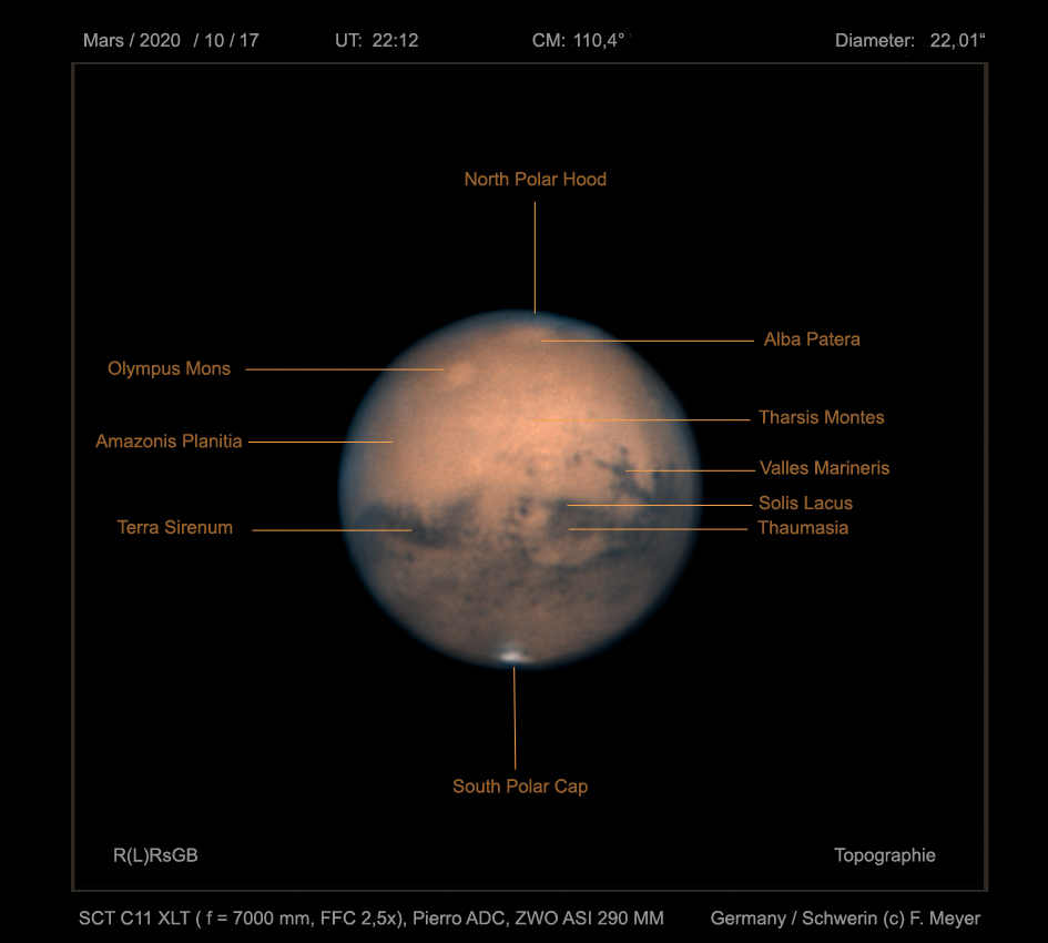 Dieses Bild zeigt eine beschriftete Marsaufnahme vom 17.10.20. Mit einem SCT C11 wurden mit FireCapture im RGB Zwei-Minuten-Videos mit 10000 bis 26000 Frames aufgenommen. Verwendungsrate für die weitere Bildbearbeitung 34 %.