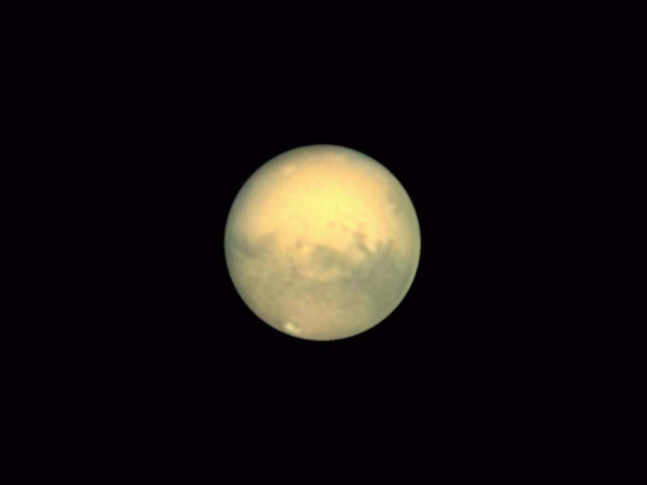 Die Entfernung zur Erde betrug rund 64 Millionen Kilometer, der scheinbare Durchmesser etwa 22 Bogensekunden. Das Seeing war durchschnittlich, bei 8 Grad Außentemperatur. Es wurden in den Farbkanälen Rot 36000, in Grün und Blau jeweils 12000 Bilder belichtet. Belichtet wurde mit 7,548 ms je Bild mit 126 Bildern pro Sekunde. Die Verwendungsrate war jeweils vier Prozent. Der Zentralmeridian lag bei rund 94 Grad. Auf der sichtbaren nördlichen Sphäre zeigt sich die vulkanisch geprägte Region Tharsis - die Position von Olympus Mons zeichnet sich als Fleck auf der "11 Uhr-Position" ab. Im Zentrum der Marsscheibe ist die Formation "Solis Lacus" zu erkennen. Östlich davon, Aurorae Sinus und etwas nördlich davon Chryse Planitia. Im südsüdöstlichen Teil der Scheibe findet sich u.a. das Einschlagbecken Argyre Planitia. Das Ausgangsbild wurde um den Faktor 2 vergrößert.