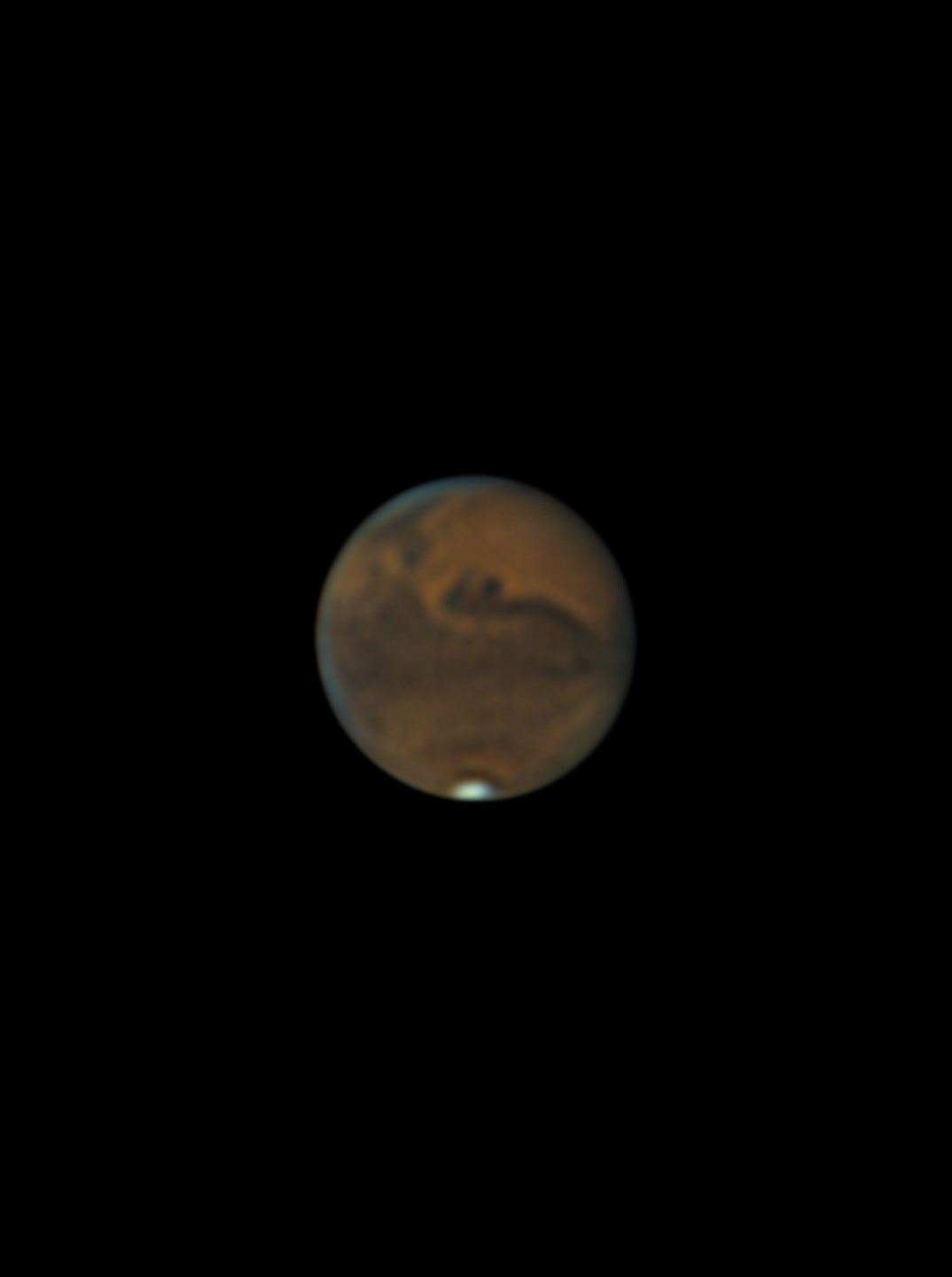 Am 21. September 2020 gelang mir bei ruhiger Luft diese Aufnahme des Mars mit meinem 5-Zoll-Teleskop. Es sind einige Oberflächenstrukturen sowie die südliche Polkappe erkennbar. Im linken oberen Bereich sind Eiswolken in der Atmosphäre sichtbar. Per 3x-Drizzle-Verfahren habe ich den Abbildungmaßstab erhöht.